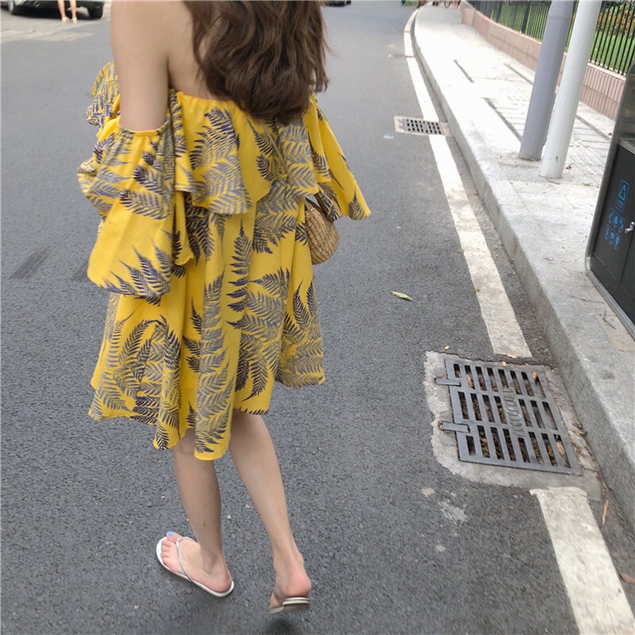 リーフ柄 チューブトップフリルワンピース オフショルダー ミニワンピース ワンピース フリルワンピ フリル 半袖 春夏 サマードレス レディース 2カラー a4401