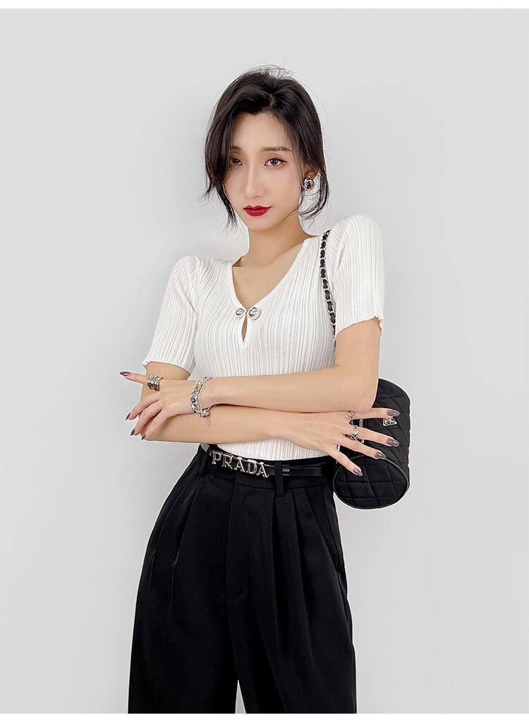 メタルボールが印象的なVネック 半袖リブニット