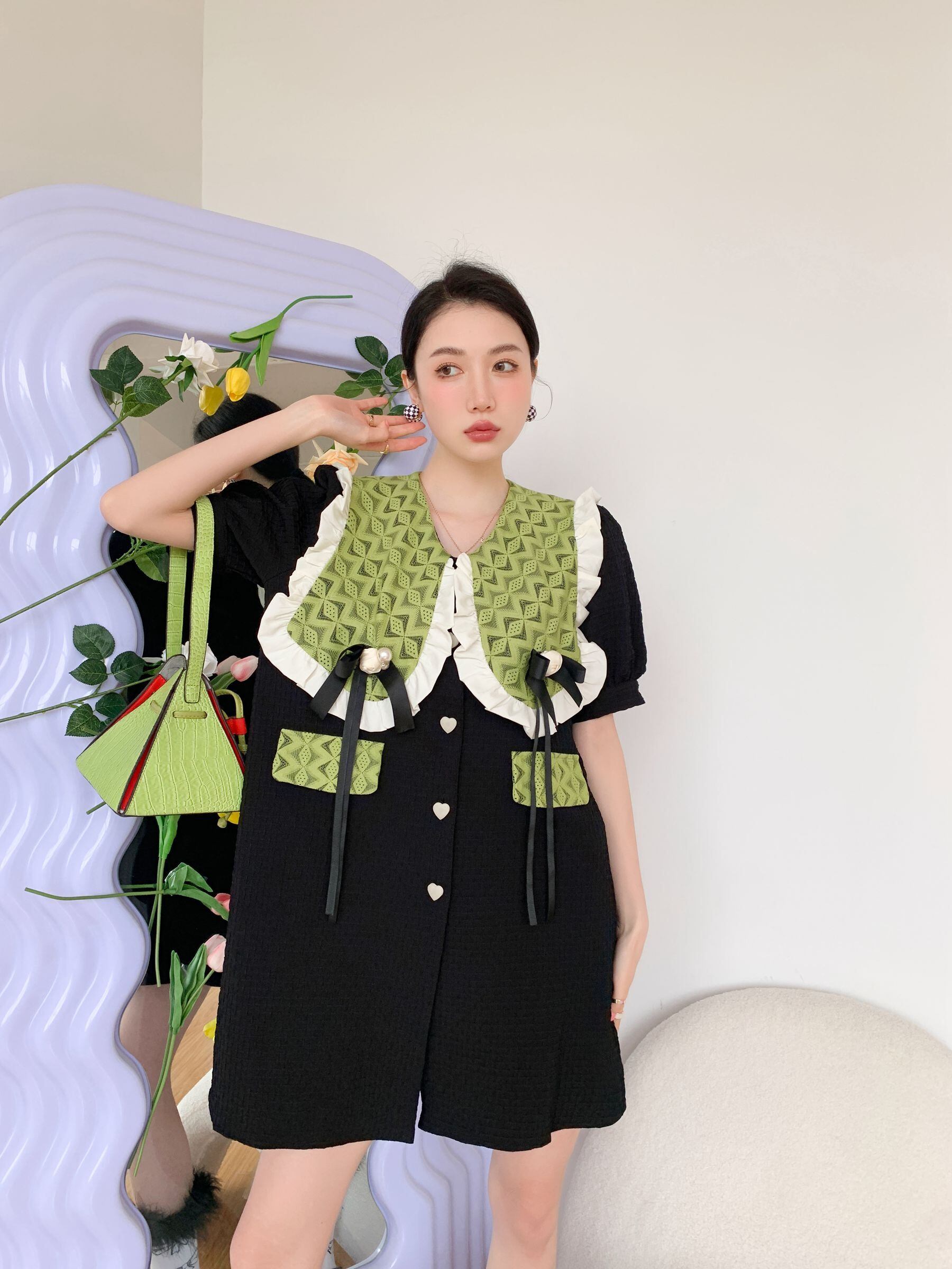 ドールカラーフレンチヴィンテージワンピース ドレス ワンピース 半袖ワンピース ニッチデザイン レディース レトロ フレンチステッチ コントラストカラー フリル ボウシャツ スカート 個性派 モード系 a4428