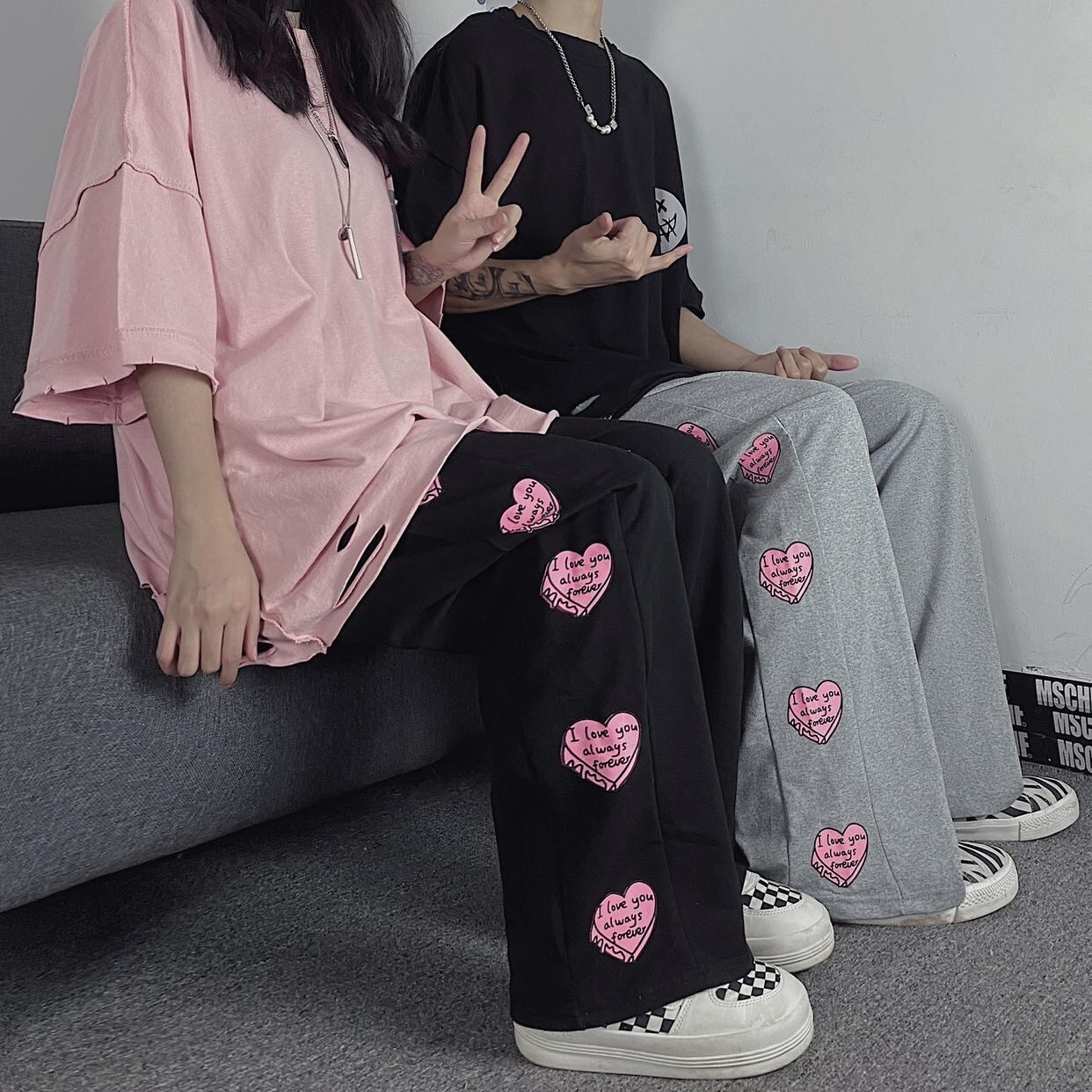 ハート プリント スポーツパンツ スウェット カジュアルパンツ ストレートパンツ 薄手 ワイドパンツ ルーズ ハイウエスト アメカジ ストリート レディース 可愛い オシャレ ボトムス C91