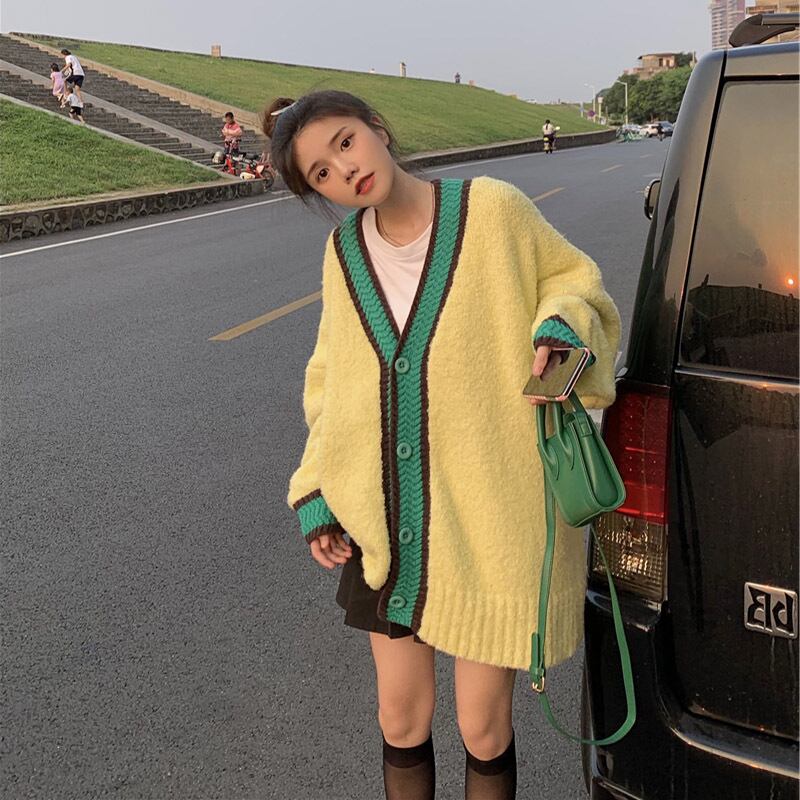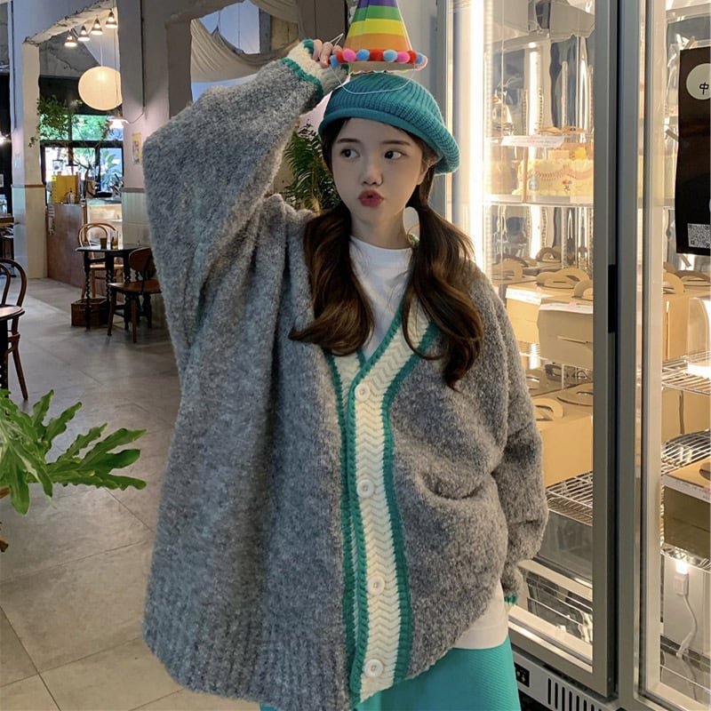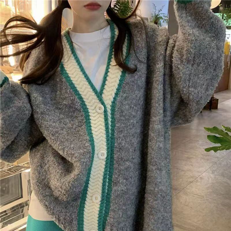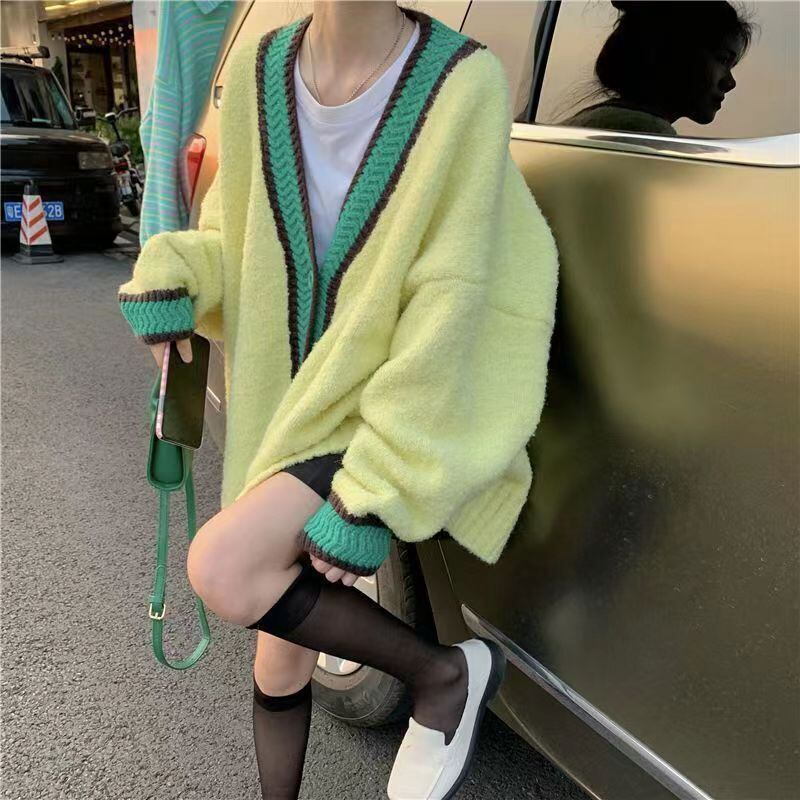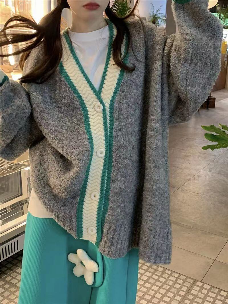 【大きいサイズあり】配色カラー Vネックニットカーディガン バイカラー ニットカーディガン ニット セーター カーディガン ジャケット アウター オルチャン オーバーサイズ 韓国 レディース 可愛い C109