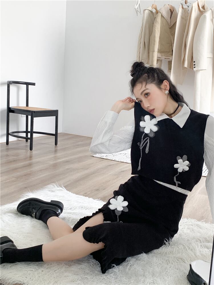 【セットアップ】立体フラワー ニットベスト+ニットスカート