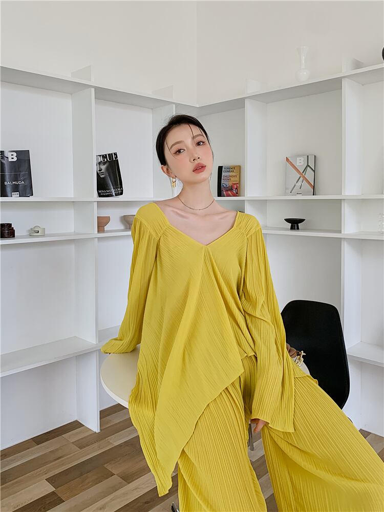 【セットアップ】イエロー Vネック プリーツ 長袖トップス+プリーツ ワイドパンツ