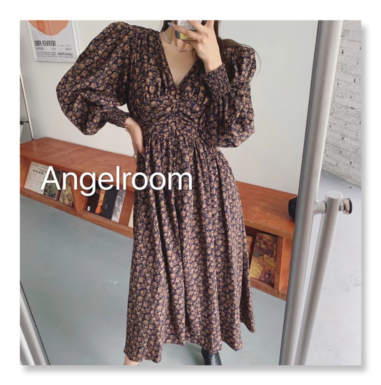 深めのVネックに大きめパフスリーブがオシャレなフレンチワンピース