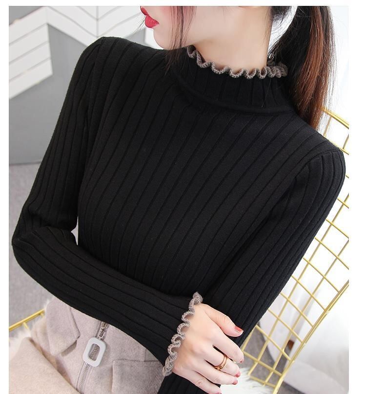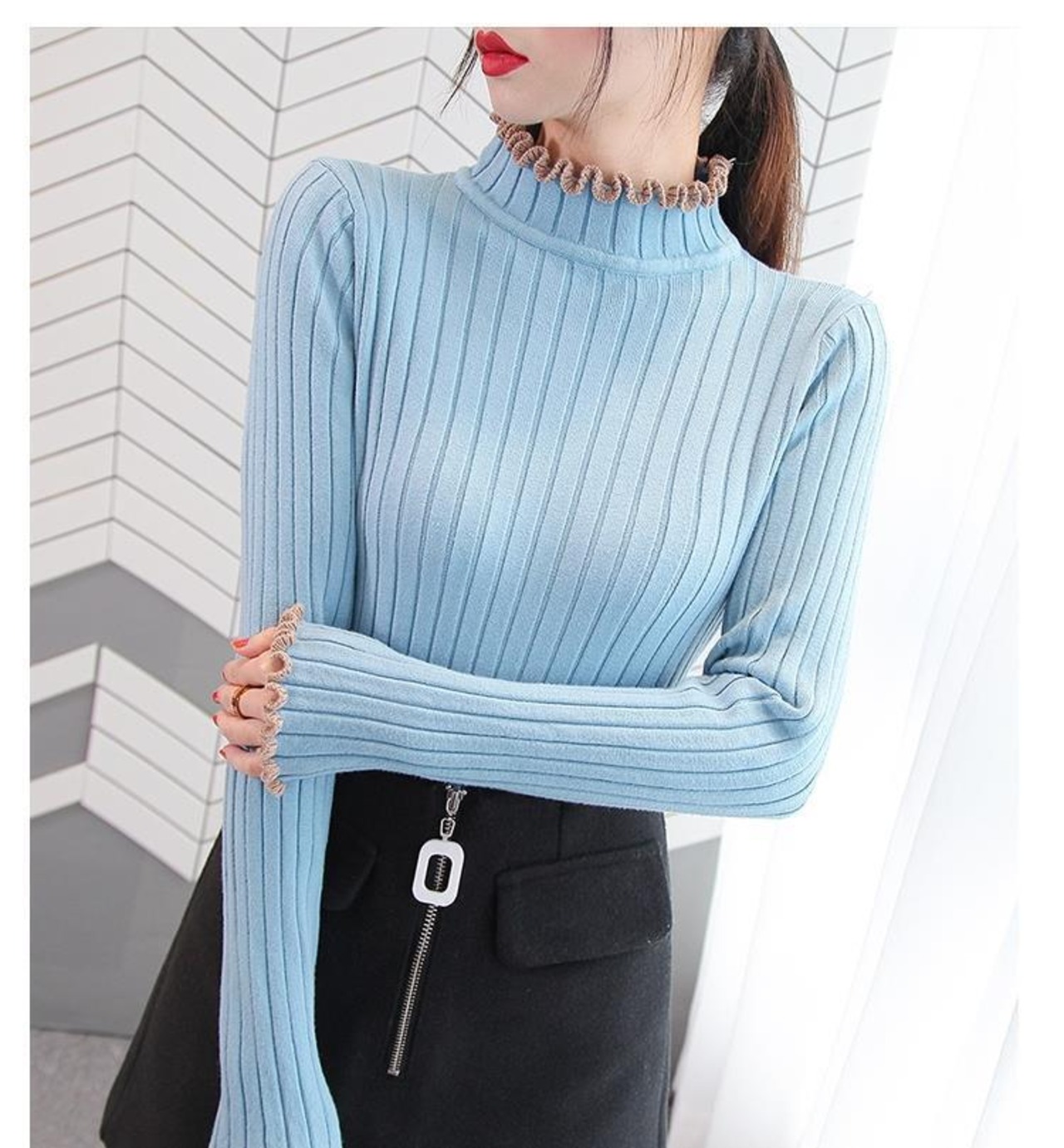 長袖ニット セーター リブ レディース ハイネック フリル タイト スリム 無地 シンプル カジュアル 上品 暖かい 防寒 秋冬 プルオーバー トップス メロウフリル ホワイト ブラック ブルー ベージュ かわいい 可愛い おしゃれ お洒落 7カラー D25