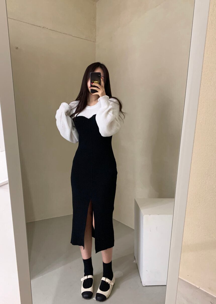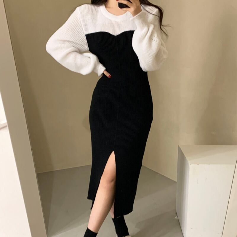 バイカラーニットワンピース ラウンドネック ニットワンピース スリム セーター ニット ドレス レディース ママコーデ デートコーデ オフィスコーデ 綺麗め 上品 a4534