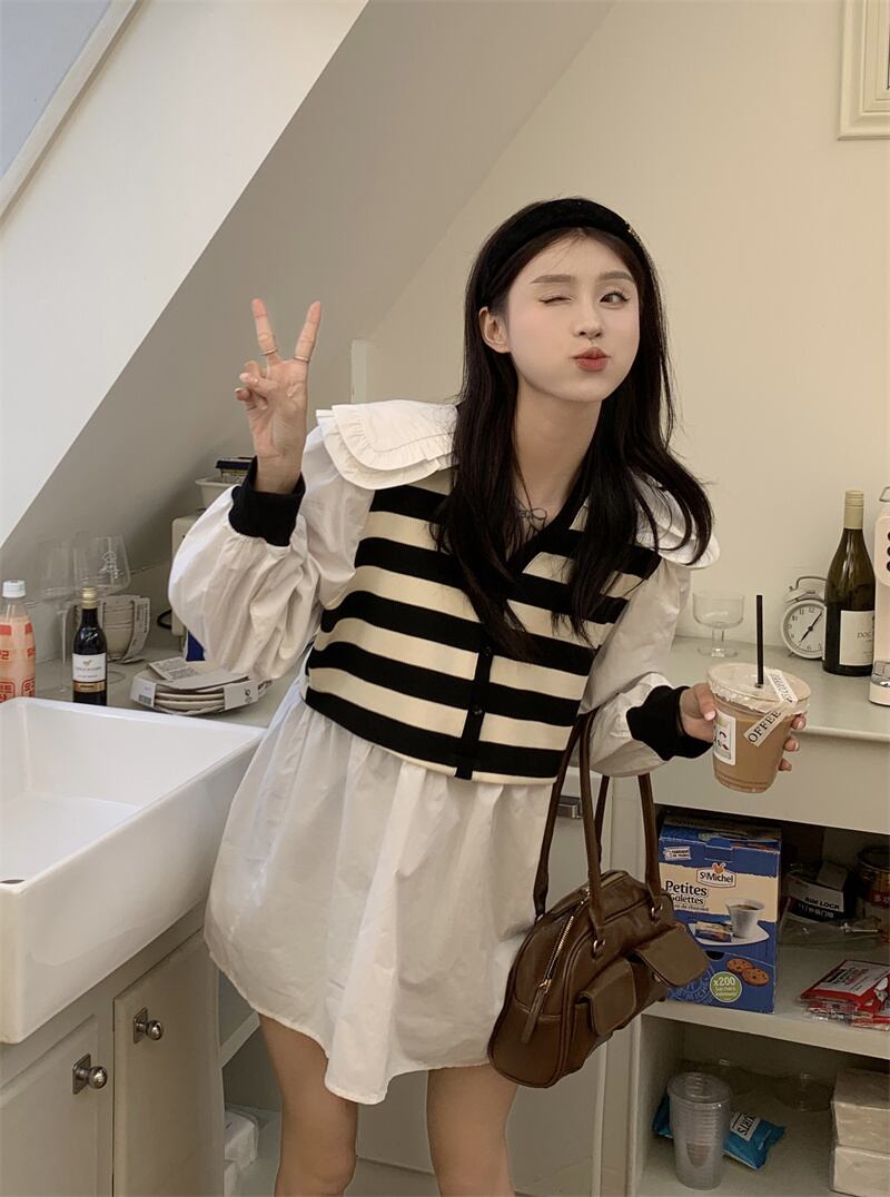 異素材MIX ボーダーニットブラウス フリルカラー ドッキングブラウス. レイヤード 風 ブラウス シャツ ニット 長袖 レディース オフィスコーデ デートコーデ. ママコーデ 2カラー a4481