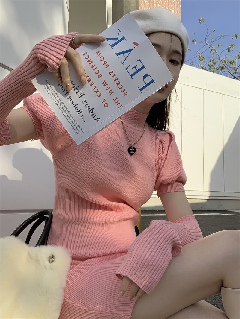 アームスリーブ付き ニットミニワンピース ミディアム丈 膝上丈 ミニワンピ ニットワンピース + アームカバー 春秋 ストレッチ タイトスカート 無地 ミニワンピ D77