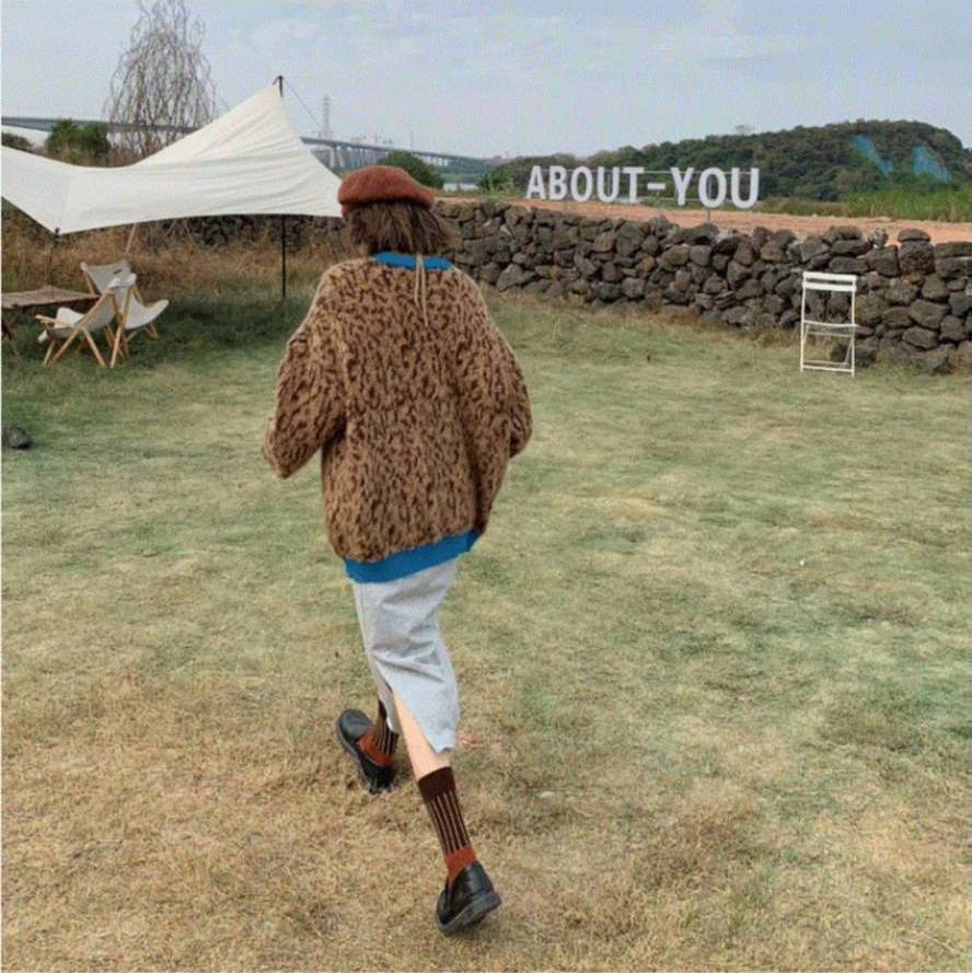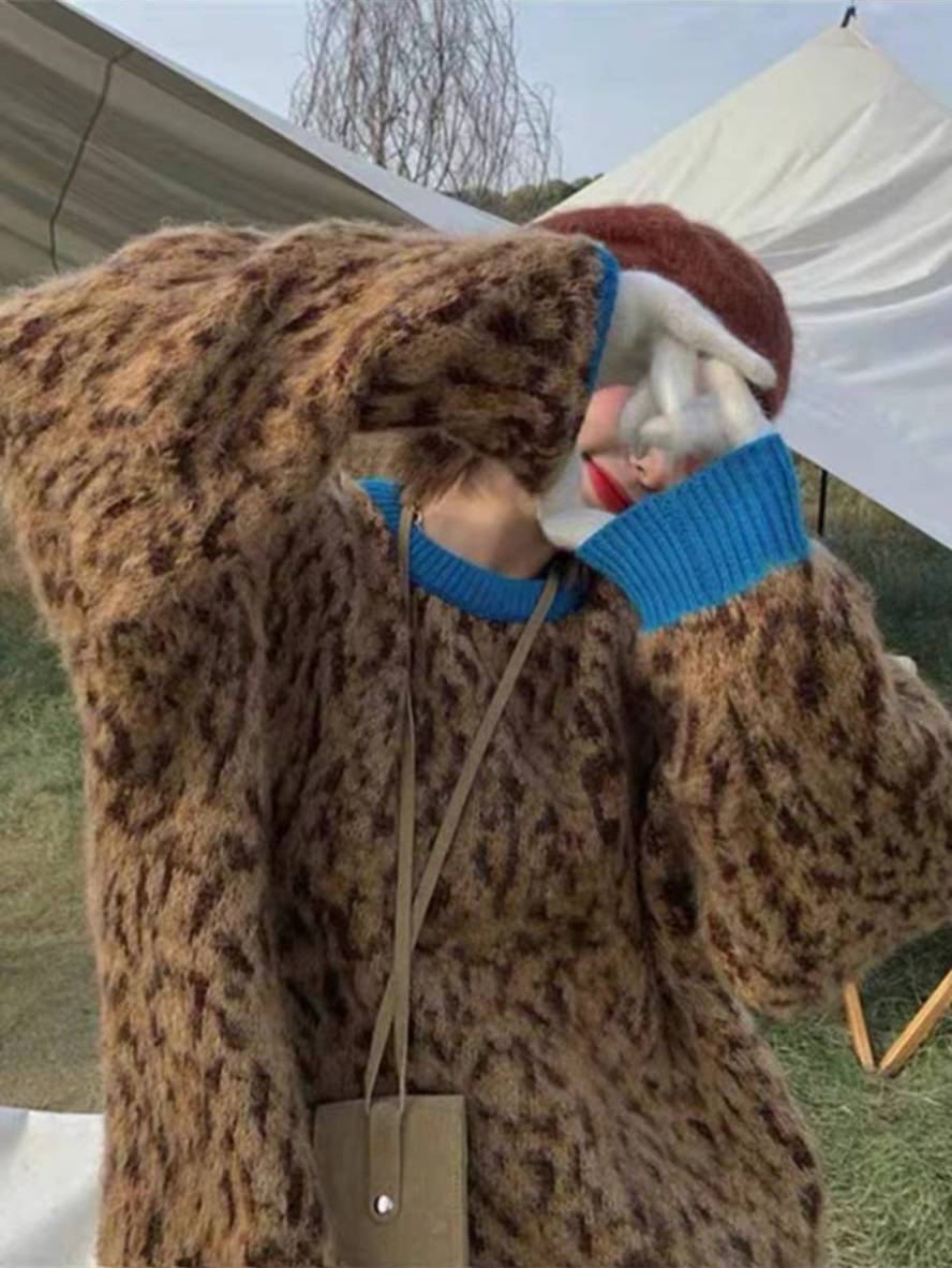 ヒョウ柄プルオーバーニット コントラストカラー ニット セーター レオパード 豹柄 トップス ミディアム丈 袖あり 長袖 ドロップショルダー 萌袖 ラウンドネック 襟なし リブ リブニット かわいい 大人可愛い カジュアル 大人 おしゃれ お洒落 大人女子 こなれ感 ルーズ 個性的 モード系 柄 格子柄 春 秋 冬 10代 20代 レディース 通勤 学生 通学 デート お出かけ 女子会 休日 旅行 着回し 普段使い 重ね着 韓国 韓国系 オルチャン 暖かい ゆったり D88