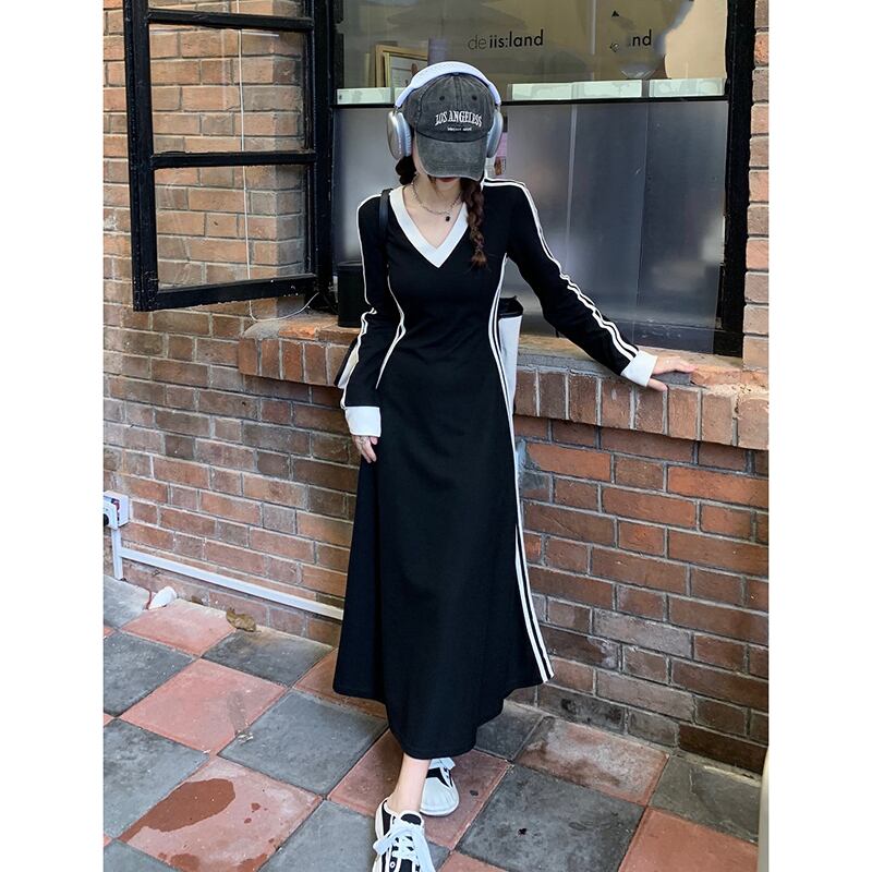Vネックストライプワンピース ロングワンピース 長袖ワンピース ロング ワンピース ドレス レディース 春 夏 秋 冬 D2