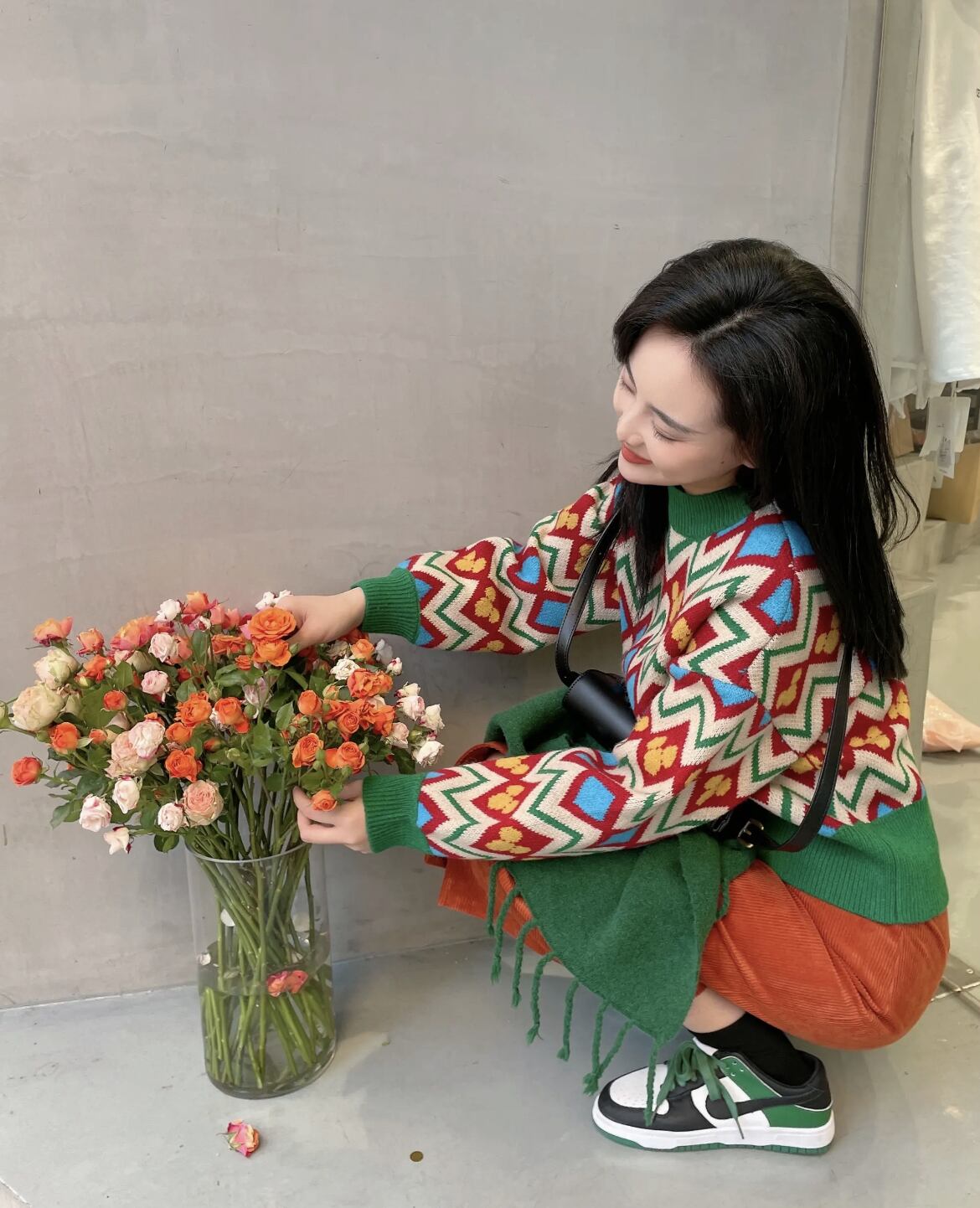 カラーブロックのちょこっと派手めニットと人気のコーデュロイスカート