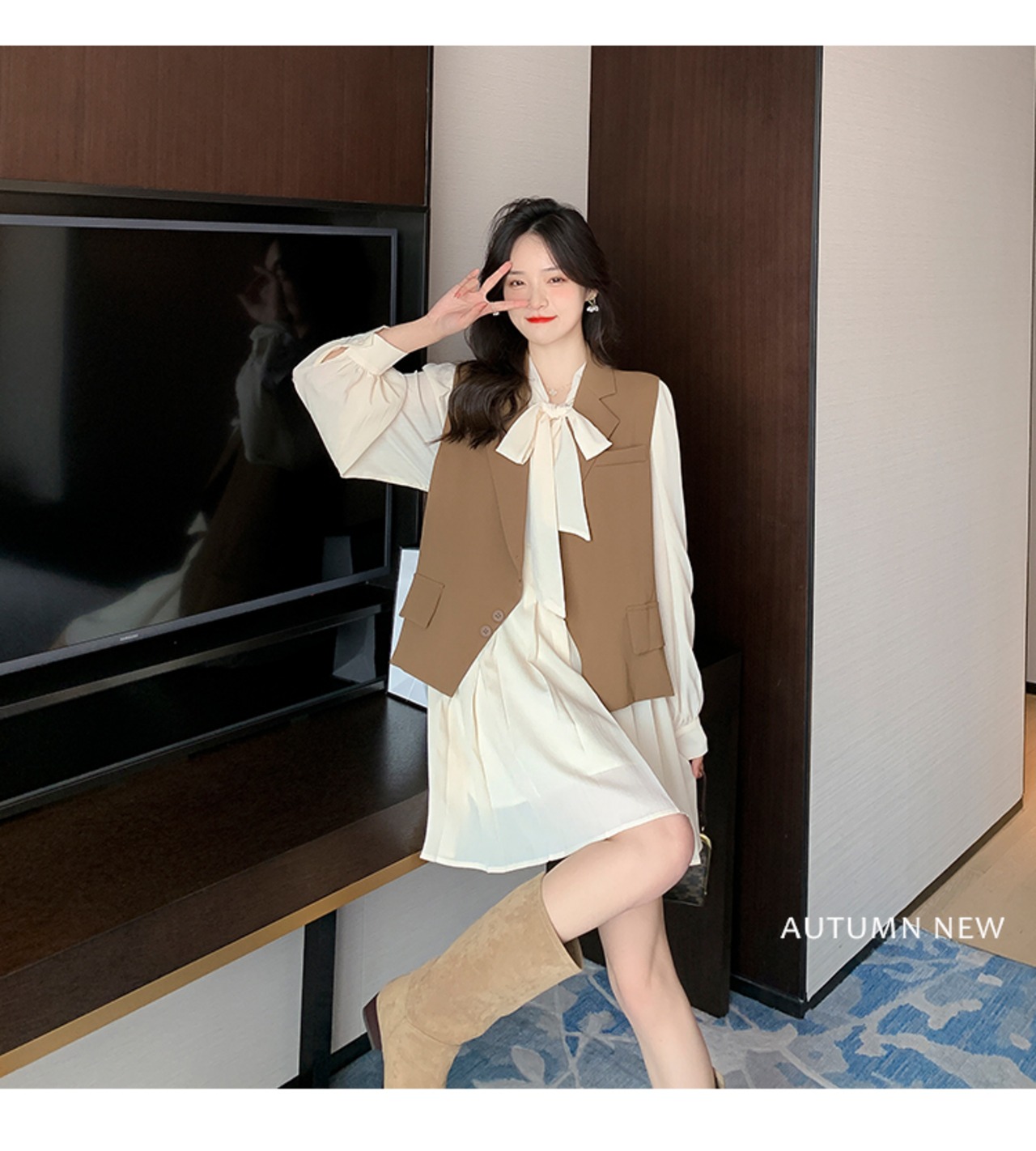 【セット】シフォンワンピース+ジレ ツーピース set up 2点セット ワンピース スーツカラーベスト ジレ レディース 通勤 ママコーデ オフィスコーデ シック 無地 D8