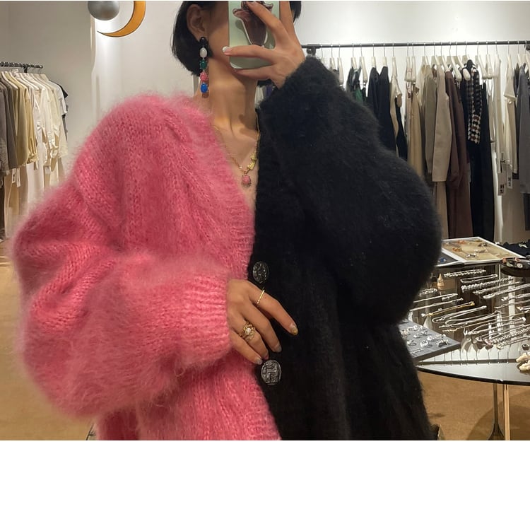 バイカラーニットカーディガン プルオーバー ニットカーディガン オーバーサイズ ニット セーター カーディガン ジャケット アウター 秋冬 レディース モヘアステッチ 韓国 オルチャン D144