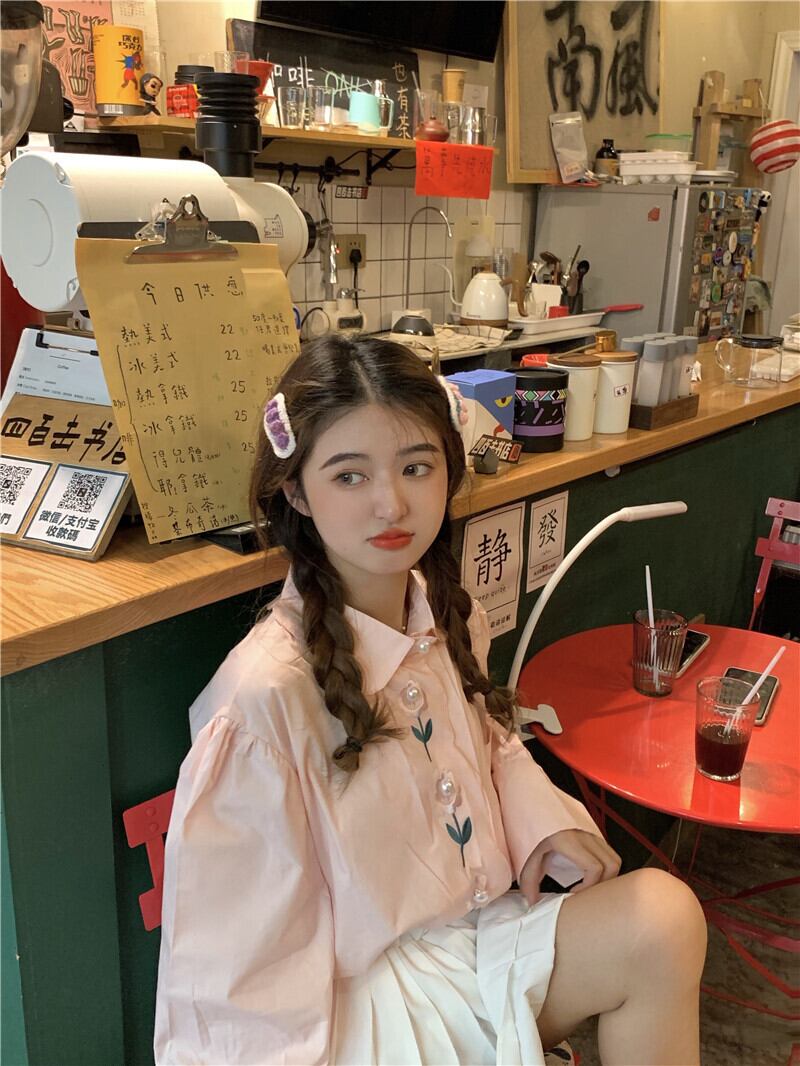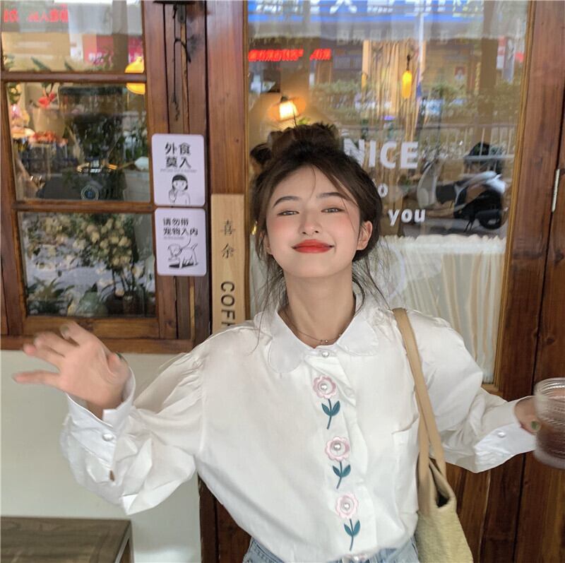 【大きいサイズあり】花柄刺繍シャツ 長袖 ブラウス シャツ ホワイト ピンク レディース トップス 刺繍 パールボタン オルチャン 通学 通勤 ママコーデ オフィスコーデ 可愛い 2カラー C241