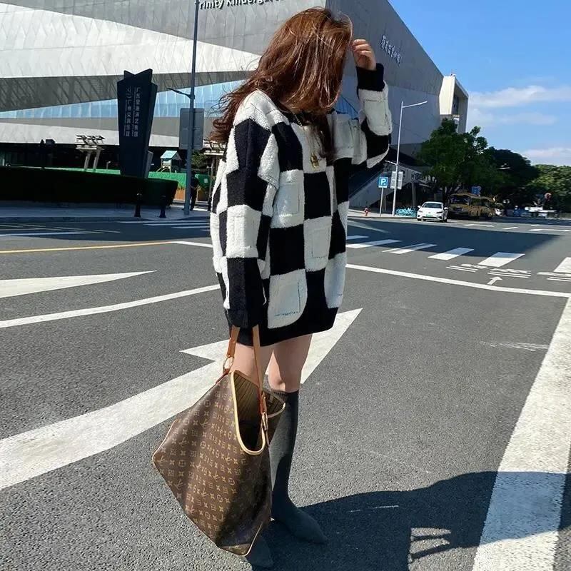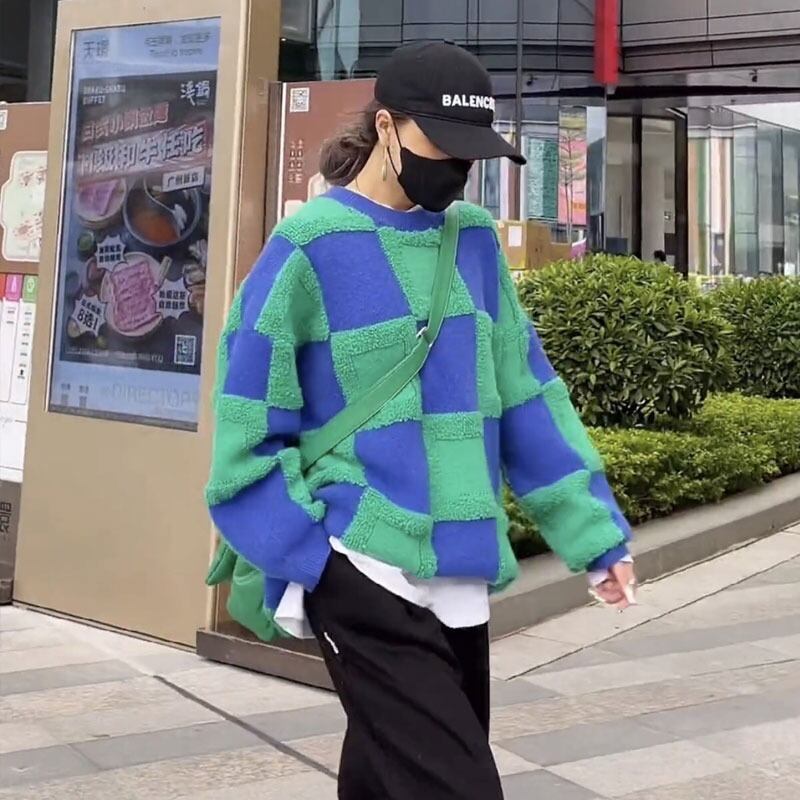 ブロックチェック柄 ニット セーター トップス ミディアム丈 袖あり 長袖 ドロップショルダー 萌袖 ラウンドネック 襟なし リブ リブニット かわいい 大人可愛い カジュアル 大人 おしゃれ お洒落 大人女子 こなれ感 ルーズ 個性的 モード系 柄 格子柄 春 秋 冬 10代 20代 レディース 通勤 学生 通学 デート お出かけ 女子会 休日 旅行 着回し 普段使い 重ね着 韓国 韓国系 オルチャン 暖かい ゆったり D36
