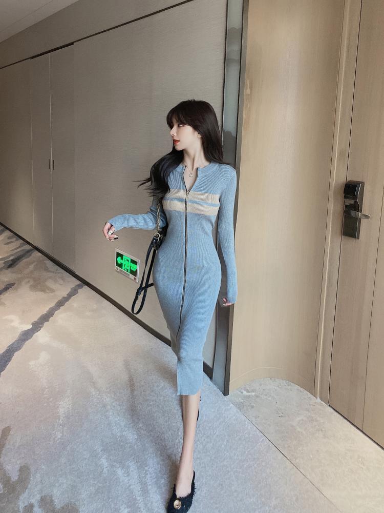 ファスナー付きニットワンピ ワンピース ニットワンピース ロングワンピース ニットワンピ ニット タイトスカート タイトワンピース スレンダー 大人可愛い きれいめ セクシー ワンピ ミモレ丈 ひざ丈 膝丈 長袖 袖あり カジュアル D43