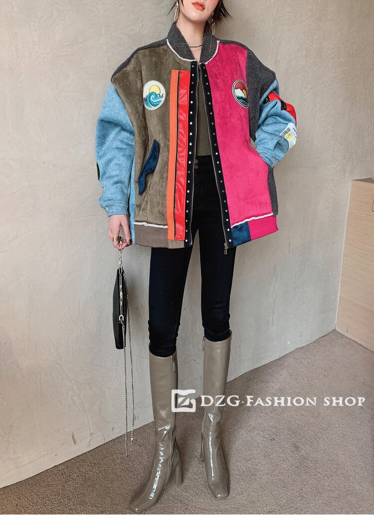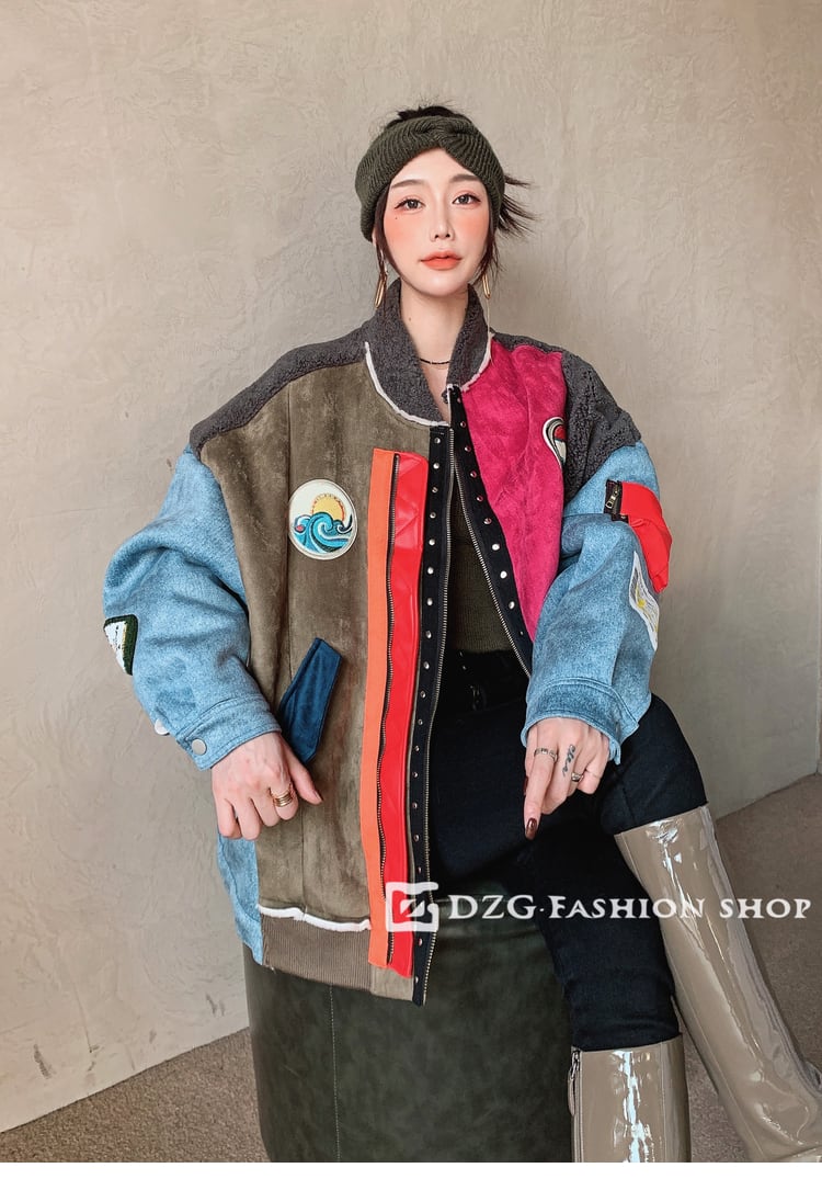 異素材MIXジャケット ボアジャケット デニムジャケット ウールコート トリコロールカラー ジャケット ブルゾン 厚手 ジャンパー コート レディース カジュアル ルーズ アメカジコーデ ストリート 10代 20代 30代 D235