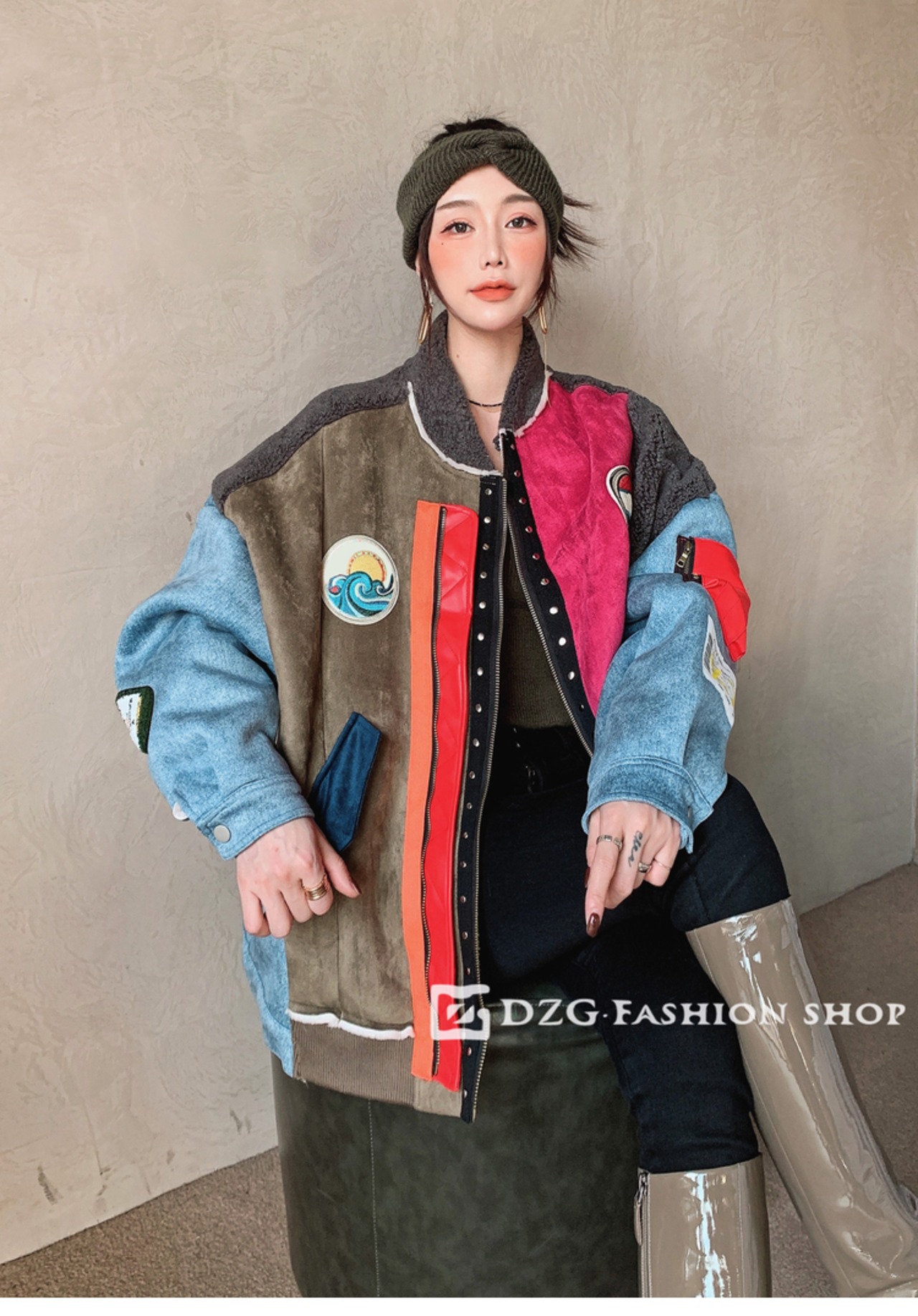 ボア素材×ウール素材×デニム素材×カラフル×ワッペン