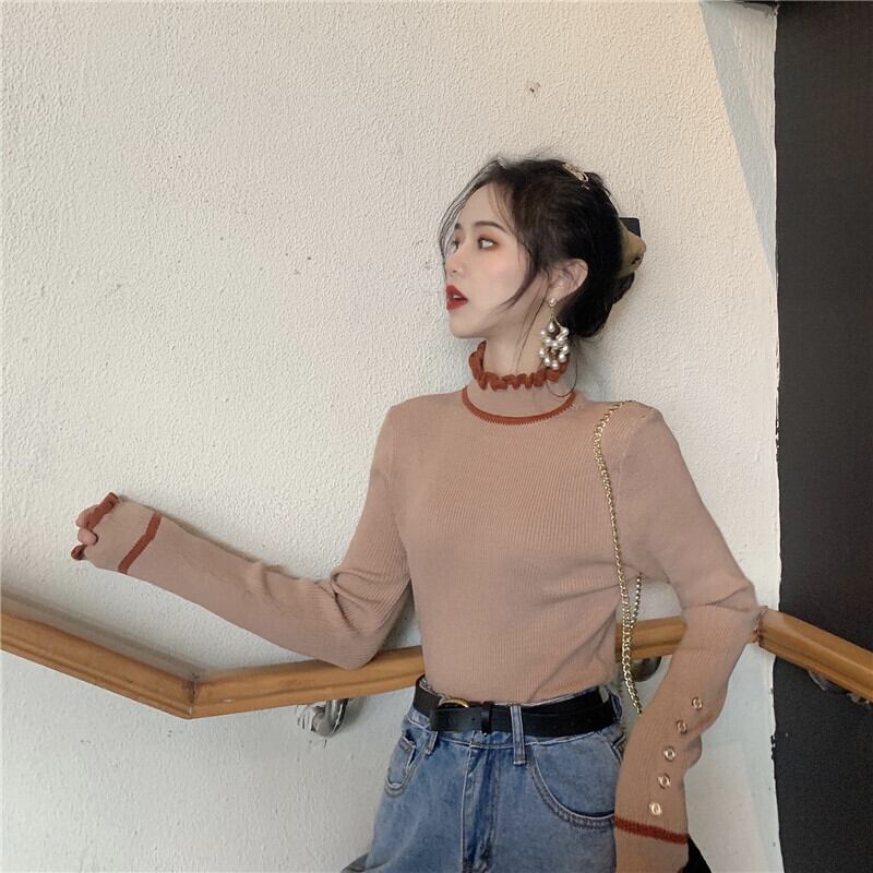 ハーフタートルネックフリルボトミングニット トップス レディース ニット 長袖 韓国 韓国服 韓国ファッション フリルタートルニット フリル タートル セーター 可愛い お洒落 女子力 レディース服 ベージュ ブラック ピンク 黒 細見え 華奢 ハーフタートル 3カラー D233