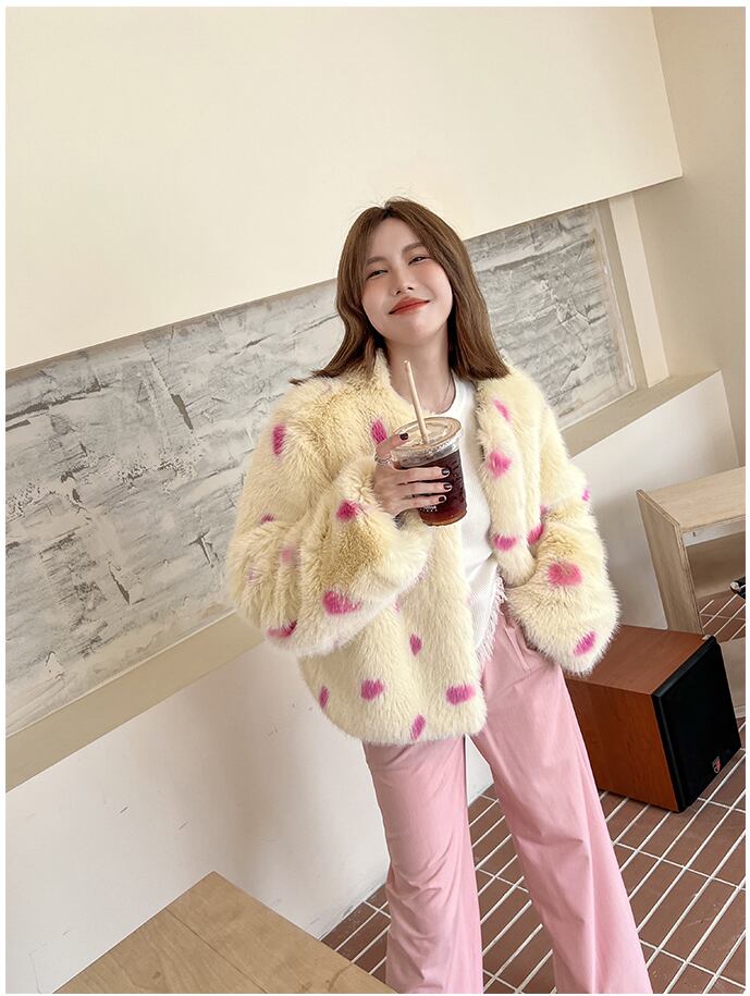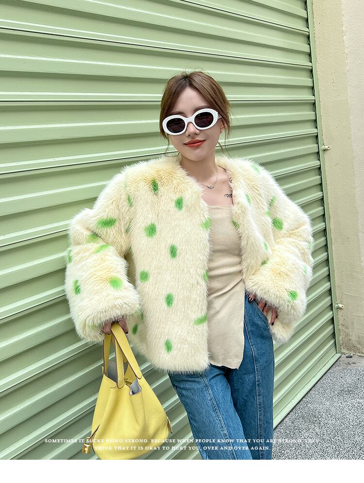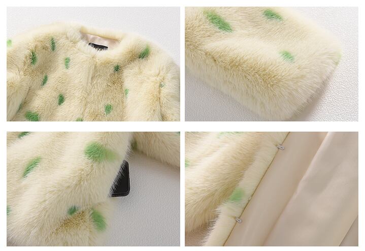 ダルメシアン柄が可愛いノーカラーエコファーコート