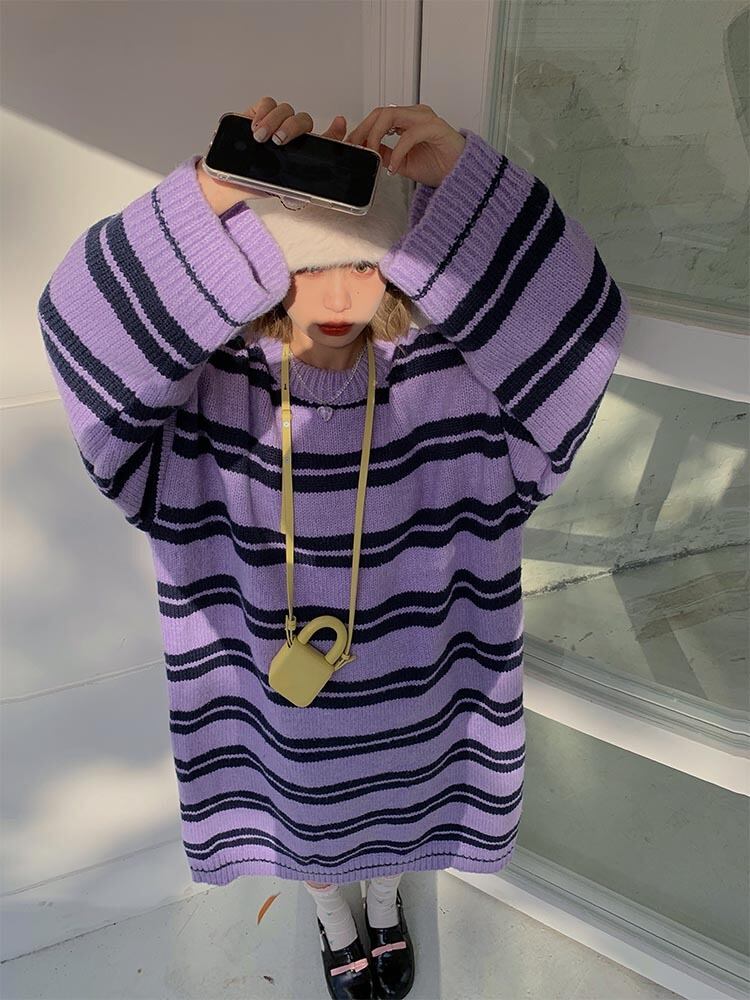 ゆったりしたサイズ感が可愛いストライプロングセーターワンピース