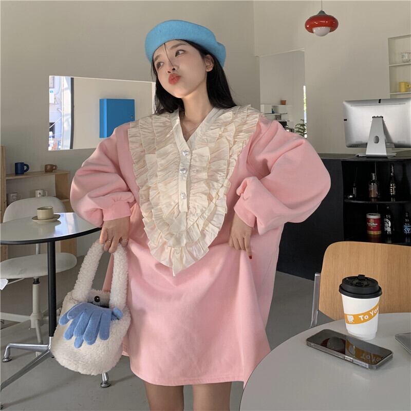 BIGフリルカラー フリースセーターワンピース 長袖 ワンピース ドレス 膝丈ワンピ 可愛い カジュアル デート オルチャン 2カラー D359