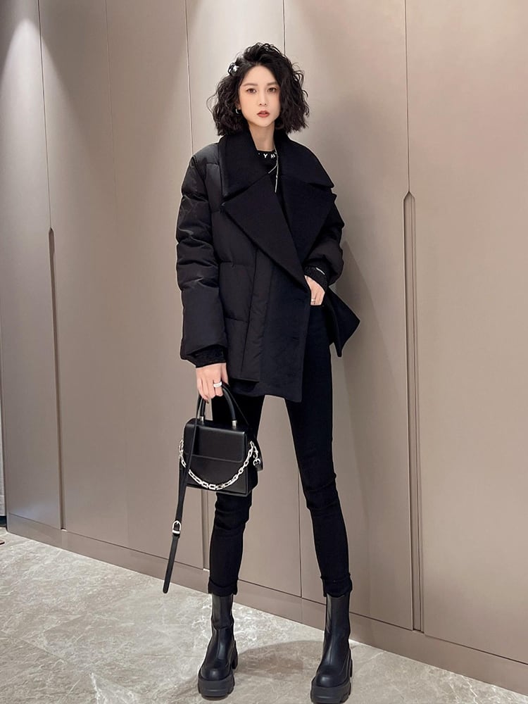異素材MIXダウンジャケット ウールコート ダウンジャケット スーツカラージャケット ダウンコート ジャケット コート アウター レディース ルーズ ブラックコーデ モード系 大人上品 カジュアル D381