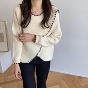 長袖ニット ステッチ ニット 長袖 クルーネック スカラップ 秋 冬 セーター レディース ファッション 韓国 オルチャン C320