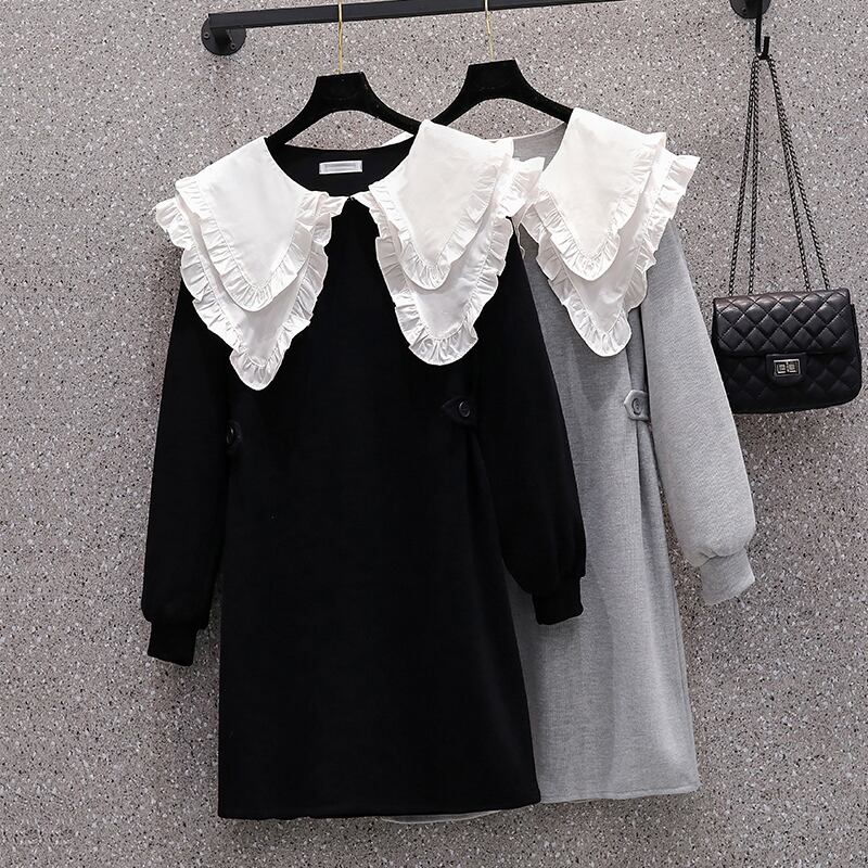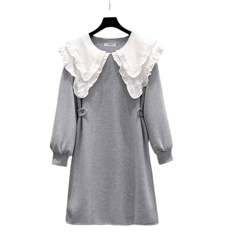 【大きいサイズ】フリルカラーワンピース スウェットワンピース セーターワンピース 長袖ワンピ ガーリー ワンピース ドレス 可愛い 秋冬 レディース ルーズ 膝丈ワンピ 2カラー a4580