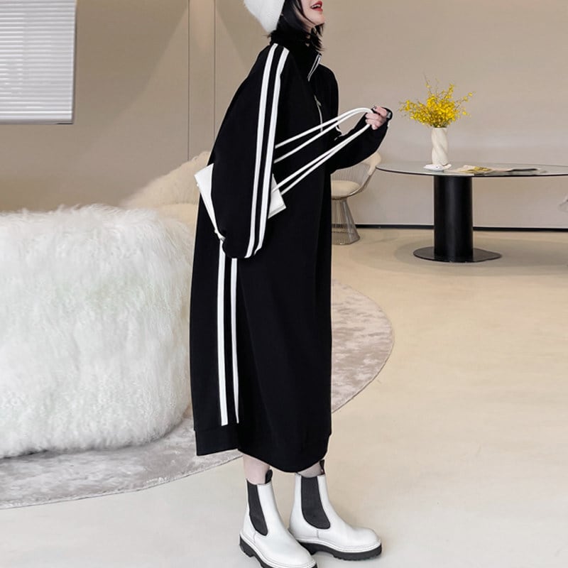 ハーフジップスウェットワンピース 大きいサイズ レディース ライン ジャージ ワンピース スポーティー 長袖 ロングオーバーサイズ 韓国ファッション トレーナーワンピース ブラックコーデ a4585