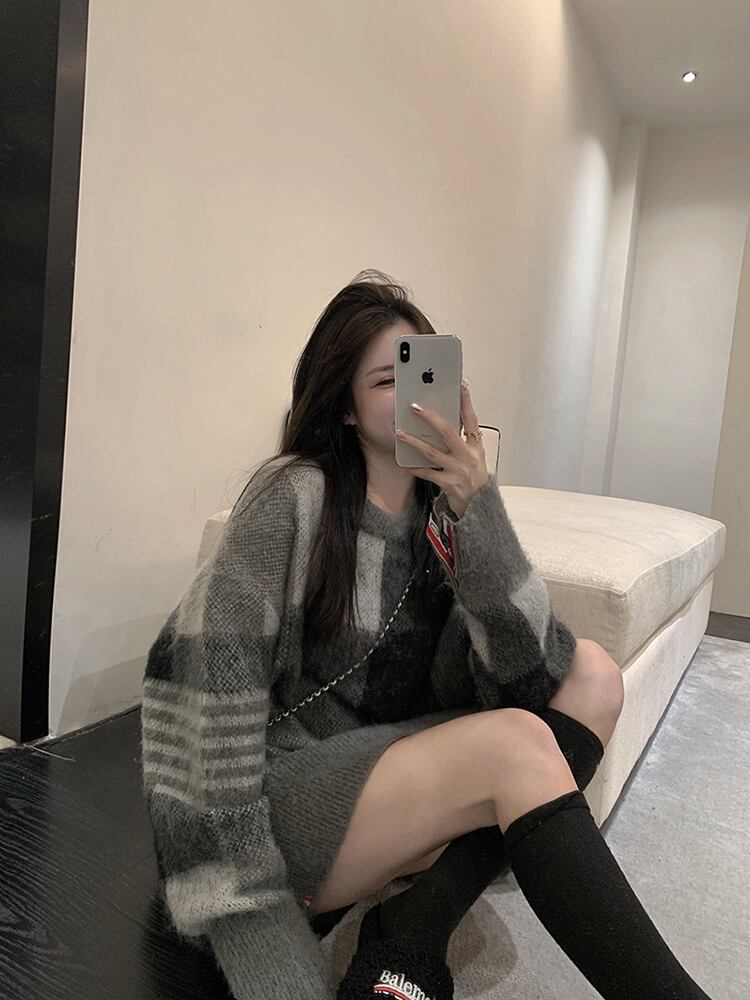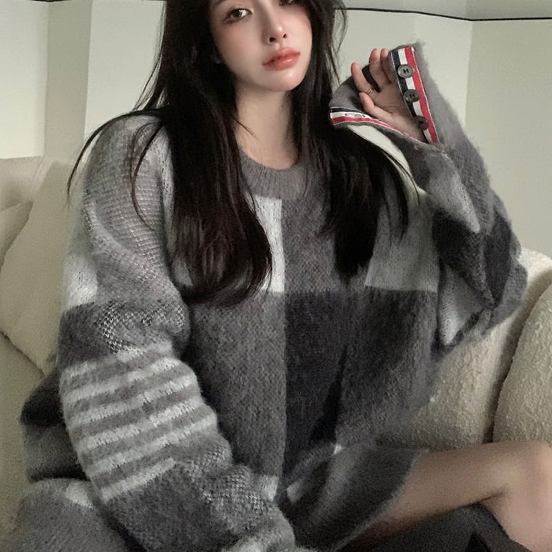 配色ジャガードチェックニット プルオーバー チャック柄 ニット セーター. トップス オーバーサイズ グレー レディース 可愛い 韓国 C314