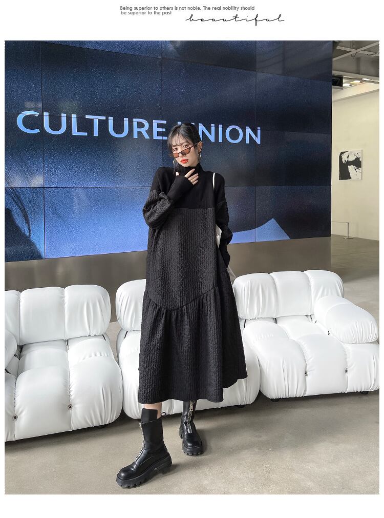 異素材ワンピース ロング ワンピース レディース 長袖 春 きれいめ モード系 ロングワンピ マキシワンピース ニット 立ち襟 スタンドカラー ギャザー 大きいサイズ 体型カバー 通勤 オフィス フォーマル パーティー C318
