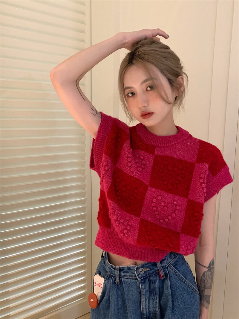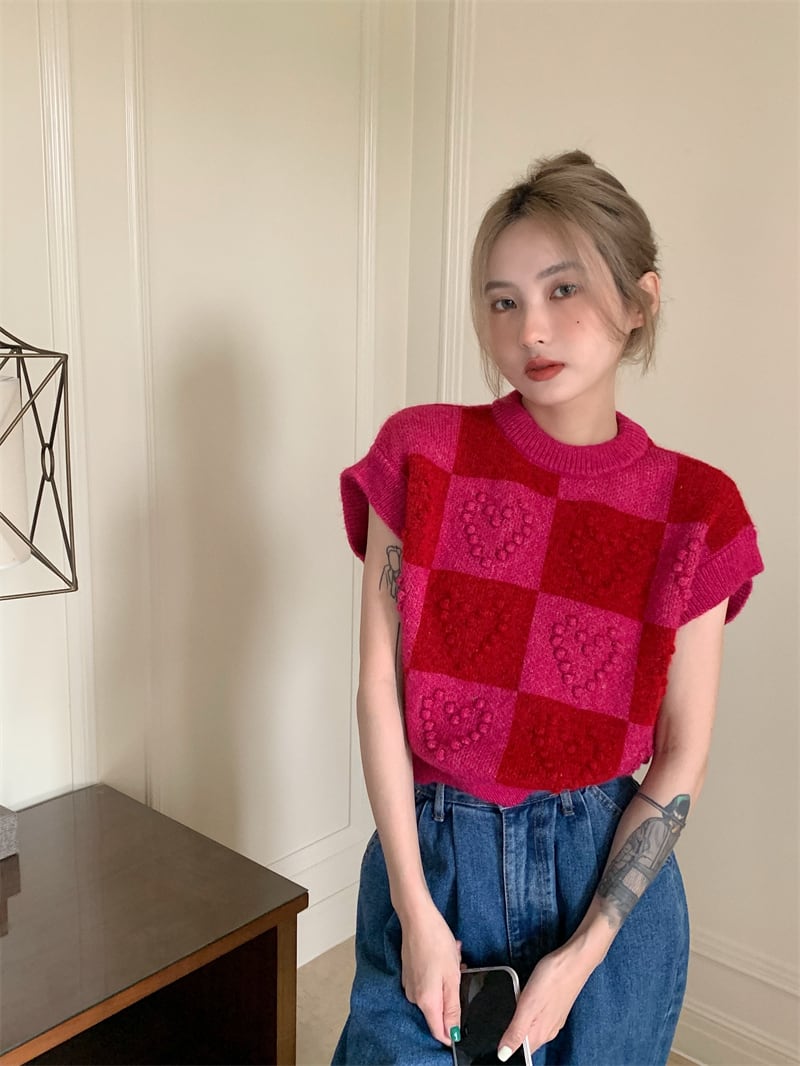 チェッカーボード柄にもこもこの立体ハートが可愛いニットベスト