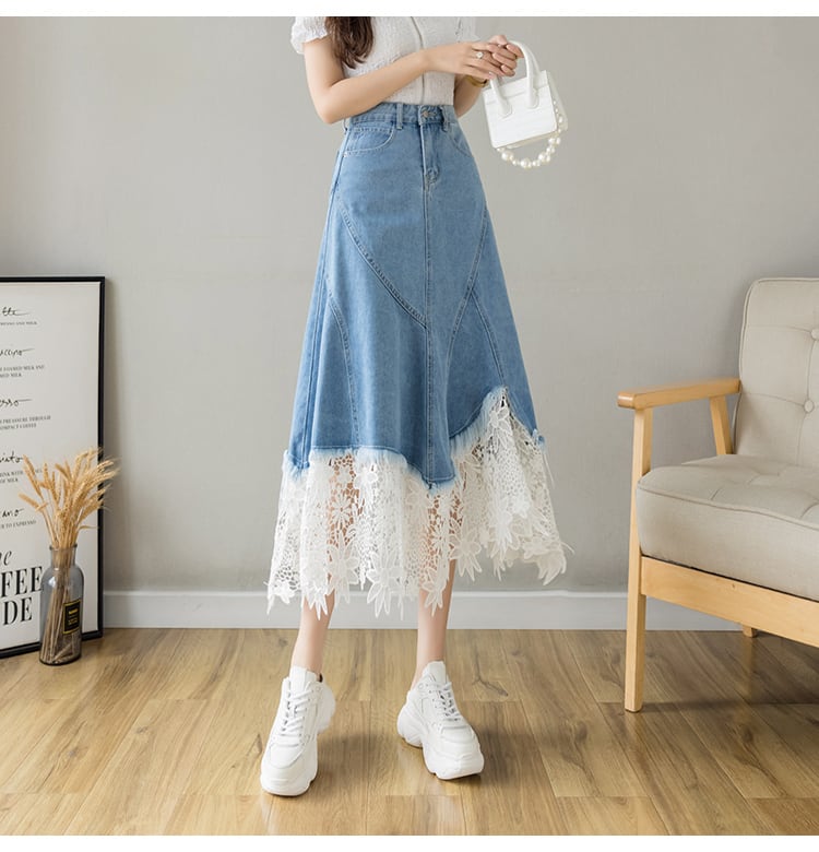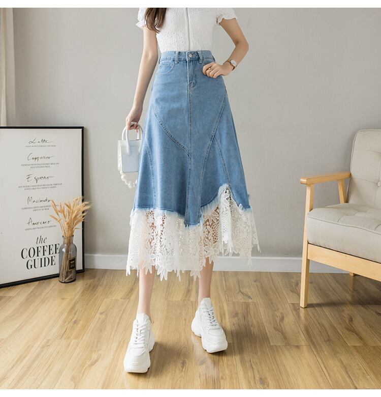 シアーレースデニムスカート デニムスカート タイトデニムスカート スリットデニムスカート レース ハイウエスト ロング レディース Aラインスカート ファッション 通勤 着痩せ 春夏 C248