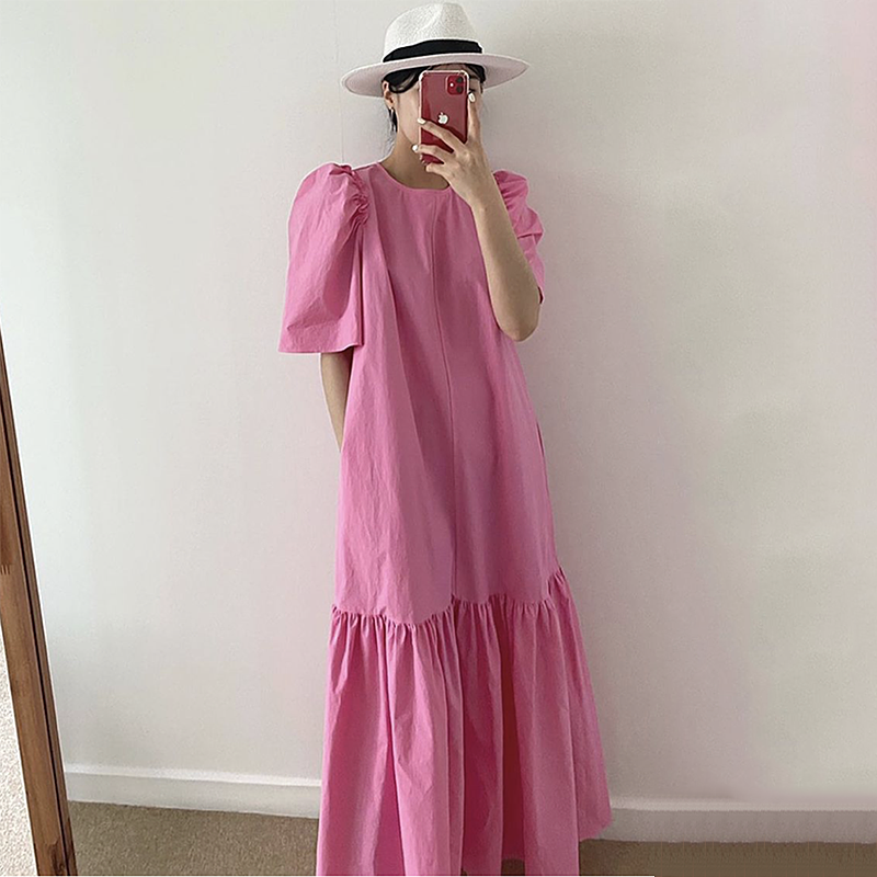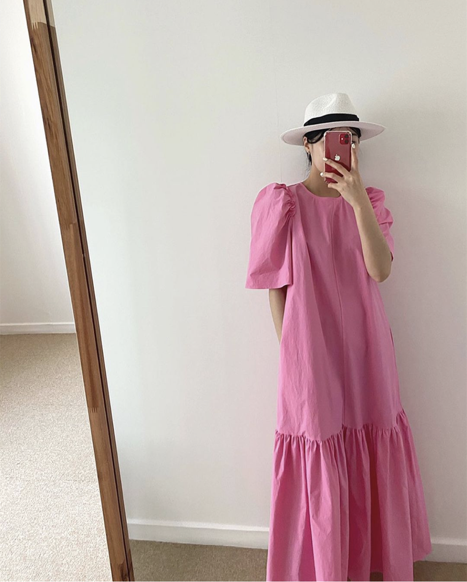 ロングフレアワンピース ラウンドネック 無地 ルーズ パフスリーブ ワンピース フレンチワンピース ドレス 半袖ワンピース ラウンドネック 半袖ドレス ロング スカート レディース 2カラー a4602