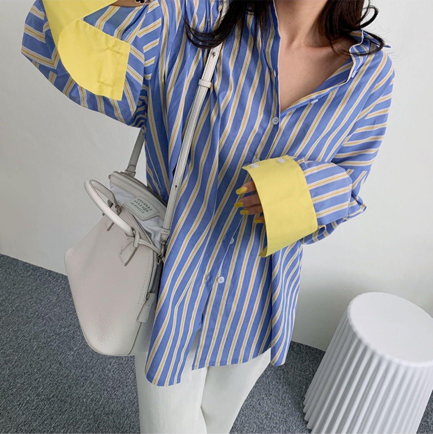 コントラストカラーストライプシャツ ストライプシャツ レディース ブルーシャツ 長袖シャツ ストライプ シャツ. ブラウス フレンチシック レトロシャツ トップス カジュアル ママコーデ お仕事コーデ 可愛い オシャレ a4634