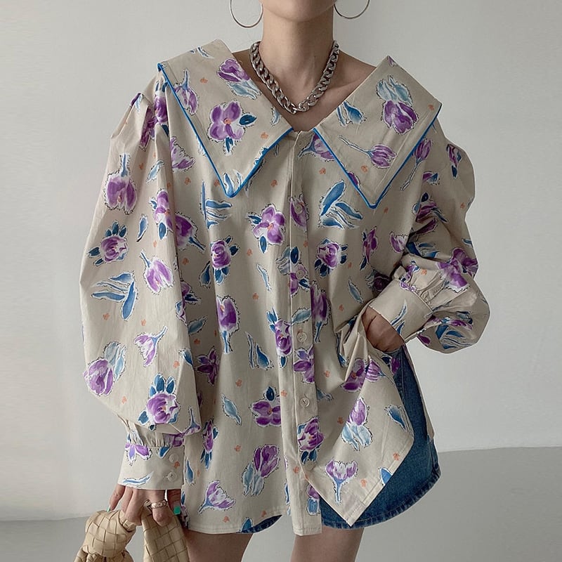 花柄シャツ プリントシャツ フレンチ ブラウス シャツ レトロ ラペルカラー フラワープリント ゆったり プルオーバー 長袖シャツ レディース シャツワンピ 韓国 オルチャン ママコーデ. お仕事コーデ 4カラー D508