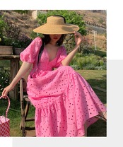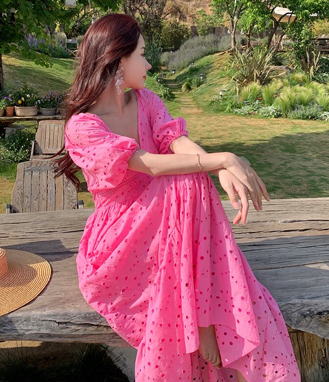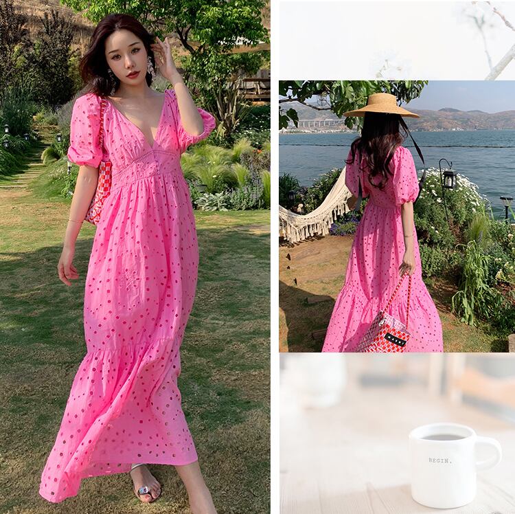 Vネックパンチングレースワンピース サマードレス ゆったり ハイウエスト マーメイドワンピース ワンピース ドレス レディース 夏 海 バケーション パンチングレース 綺麗 可愛い ピンクワンピース C325