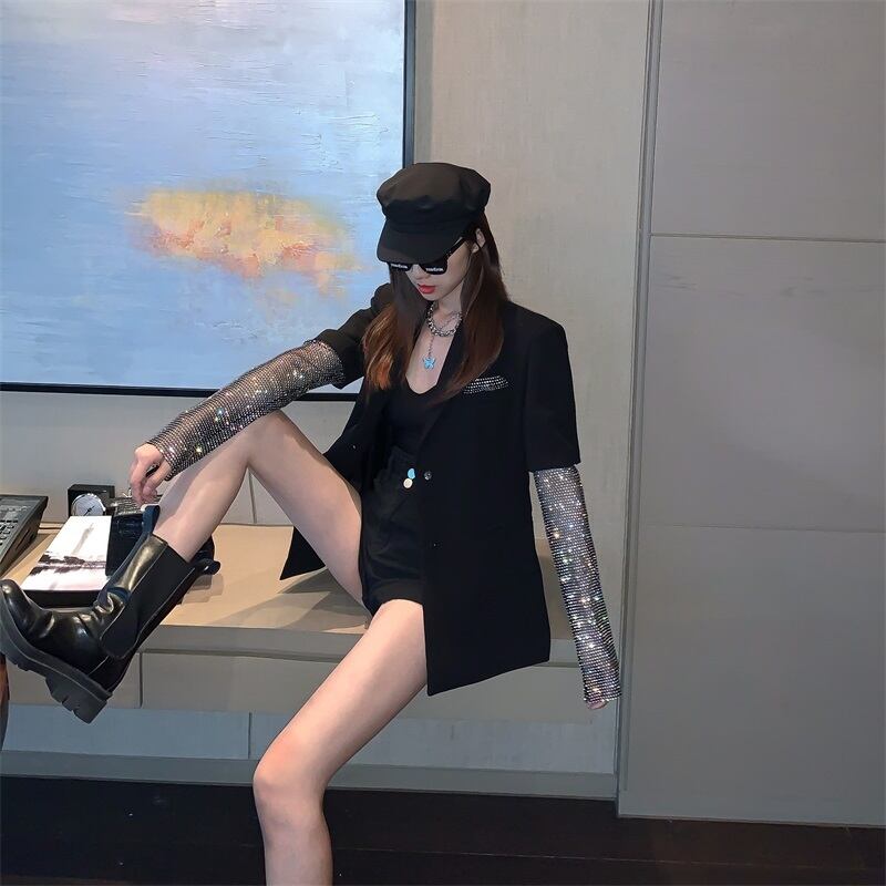 ラインストーンスリーブジャケット テーラードジャケット キラキラ ルーズ スーツジャケット ブラックジャケット ジャケット アウター スプリングジャケット レディース 可愛い オシャレ D525