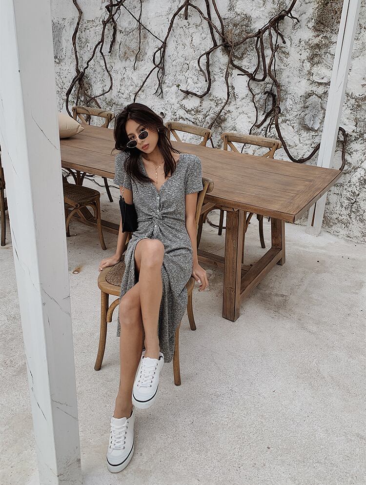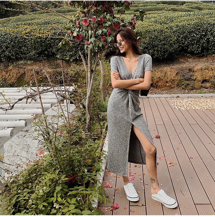 Vネックツイストワンピース ニットワンピース Tシャツワンピース 半袖ワンピース サマードレス ワンピース ドレス レディース 可愛い オシャレ スリット セクシー D558
