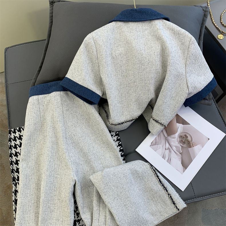 【セットアップ】ショート丈 トップス+ハイウエストパンツ ジャケット ワイドパンツ ツーピース set up 上下セット パンツ レディース ツイードステッチ D551