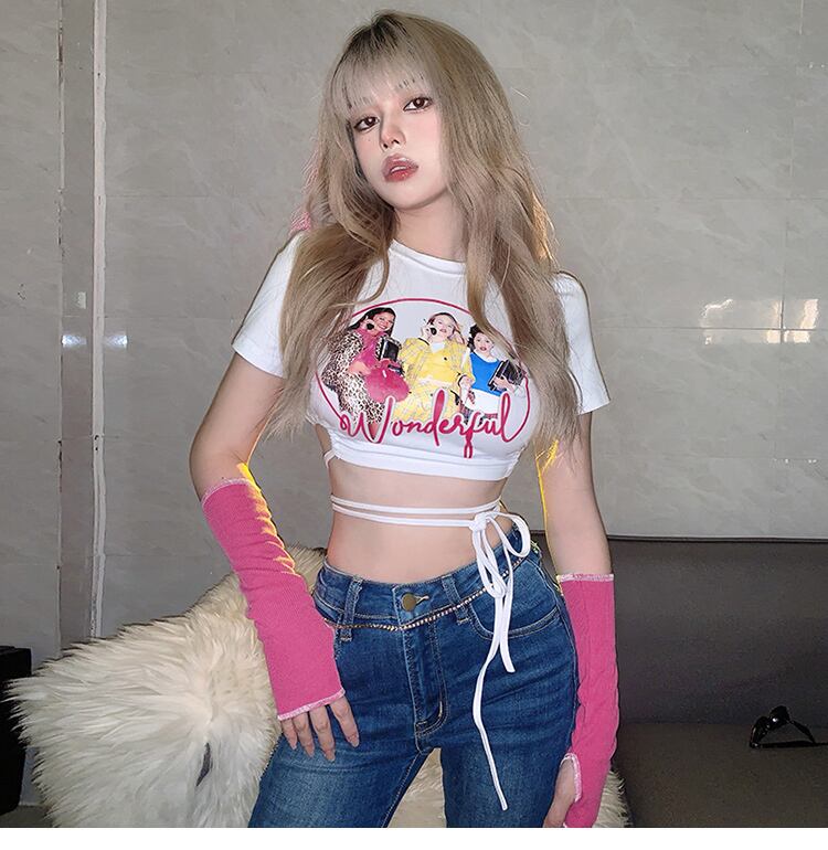 アームウォーマー付きプリントトップス アメリカンドラマトップス 長袖 半袖 Tシャツ カットソー トップス レディース アニメ 可愛い レディース 原宿系 トレンド オシャレ a4767