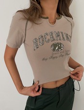 グラフィックプリントがポイントのヘソ出しクロップドTシャツ。