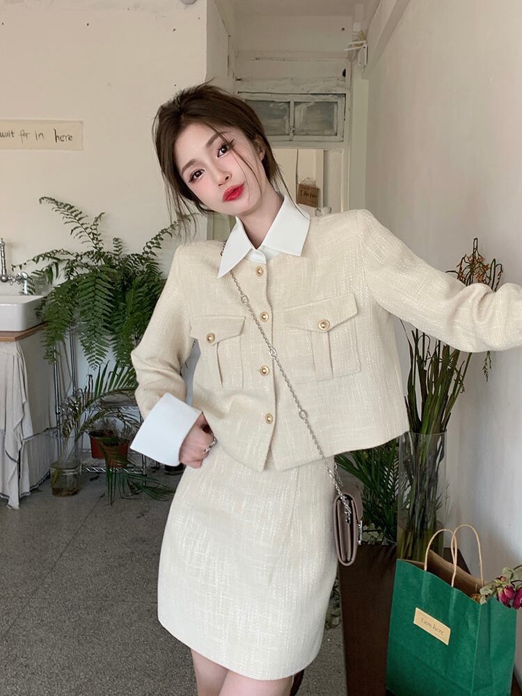 【選べるスカート丈】セットアップ ポロカラー ショート長袖ジャケット+スカート ツーピース set up レディース 韓国 オルチャン 可愛い ミニスカート ミモレスカート ジャケット C358