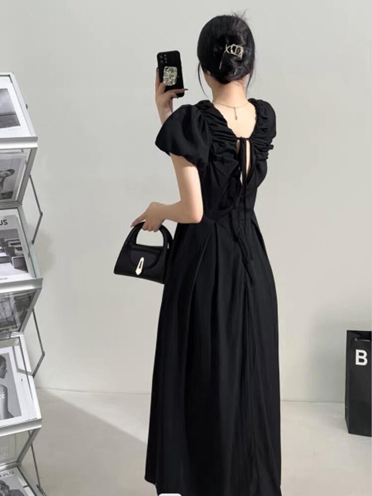 【M-4XL】Vネックブラックワンピース シャーリング ブラックワンピース. ロングワンピース パフスリーブ レディース ワンピース ドレス サマーワンピ 半袖ワンピース 綺麗め 上品 デート お出掛け パーティー お呼ばれコーデ モード系 a4850