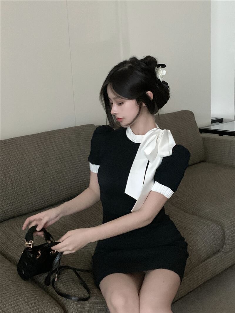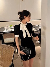 半袖ブラックワンピース. 首元リボン フレンチワンピース ミニワンピ. ワンピース ドレス パーティードレス 結婚式 お呼ばれドレス 二次会 お呼ばれワンピース ショート ミニ丈 春 夏 C389