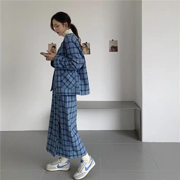 【セットアップ】チェック柄 ノーカラージャケット+スカート ルーズ ウール スーツジャケット ロングスカート ツーピース 上下セット. set up レディース D150