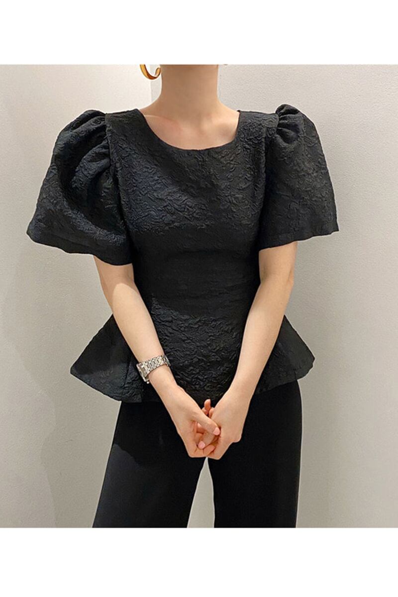 可愛らしさと上品さを兼ね備えたパフスリーブエンボスブラウス