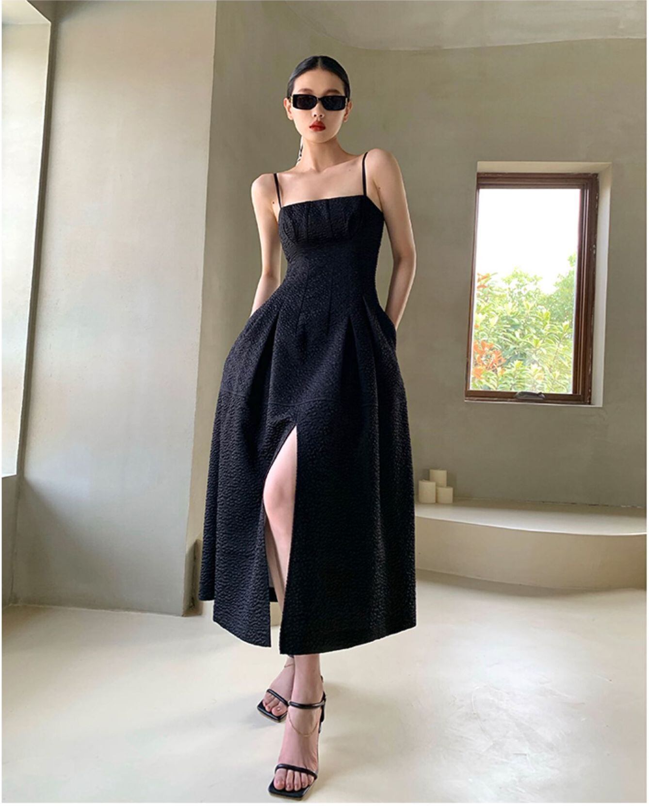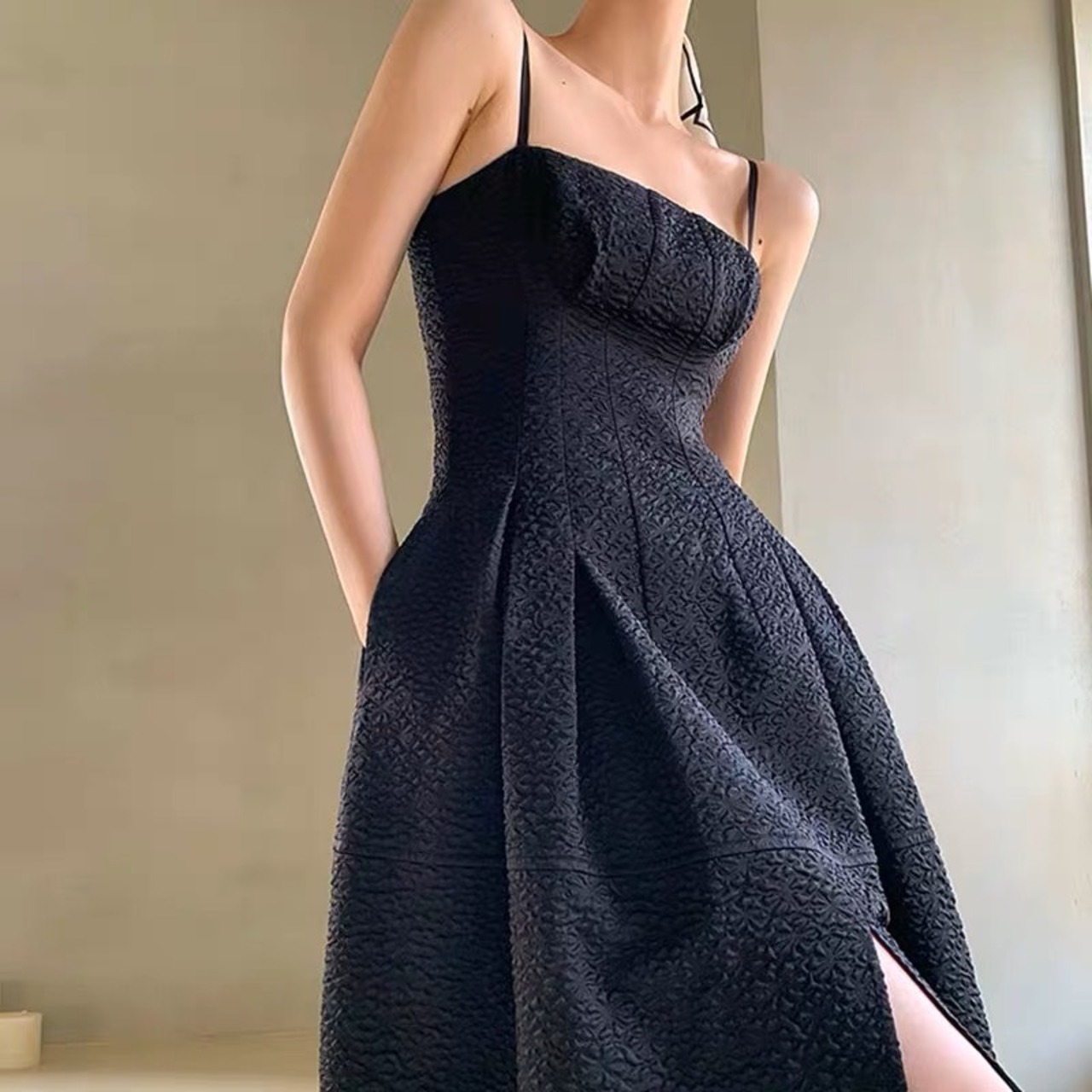 エンボスキャミソールワンピース スリット入りブラックドレスワンピース エンボス加工 キャミソールドレス ワンピース ドレス ブラックワンピ レディース モード系 綺麗 上品 パーティー お呼ばれコーデ a4905