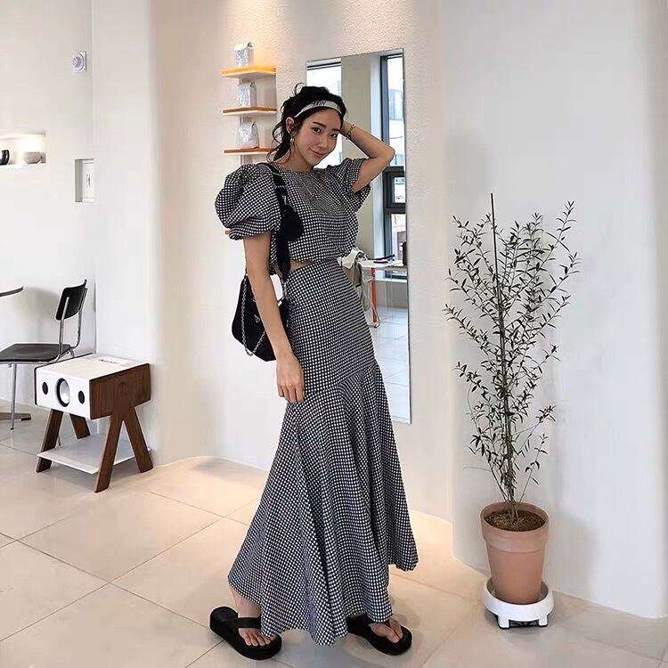 【セットアップ】ギンガムチェック柄 パフスリーブブラウス+マーメイドスカート ツーピース セットアップ ショートトップス ハイウエスト フィッシュテールスカート ブラウス シャツ マーメイドスカート レディース 可愛い オシャレ 上下セット a4900
